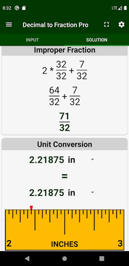 The solution steps to solve for the fraction are shown as well as a visual of the value on a measurement ruler. The result can be converted between various units.