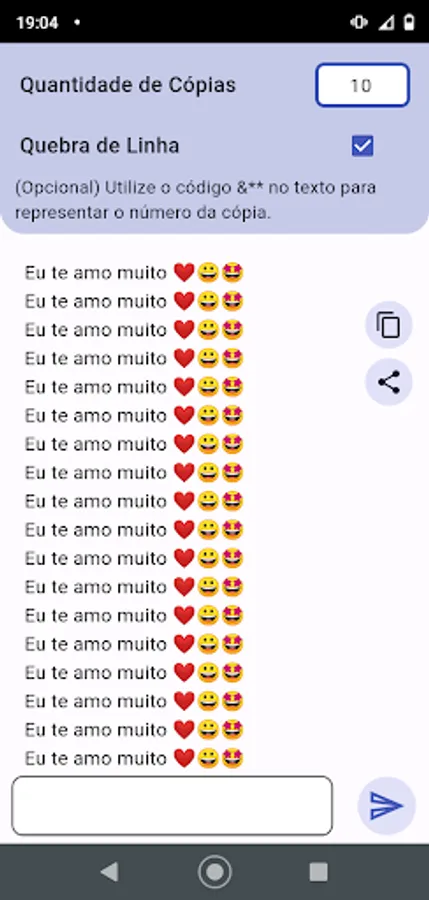 Custom Quantity: The app allows you to define the exact amount of copies you want to create of the text. Whether copying just a few times or hundreds of times, the choice is yours.