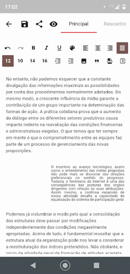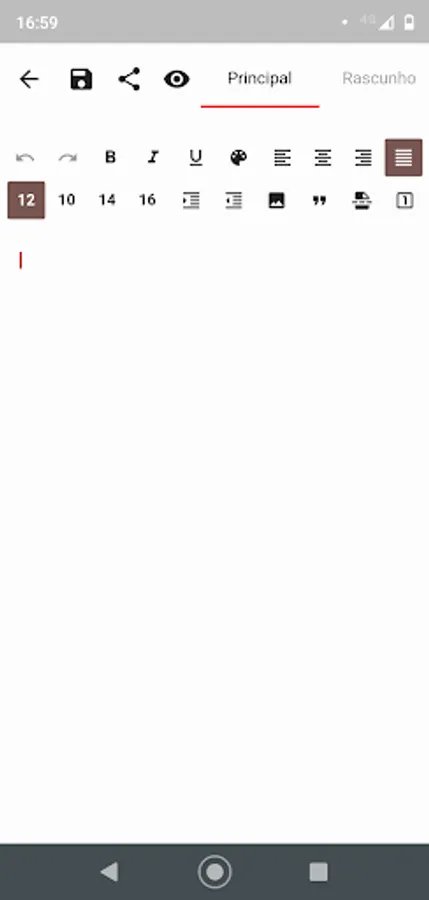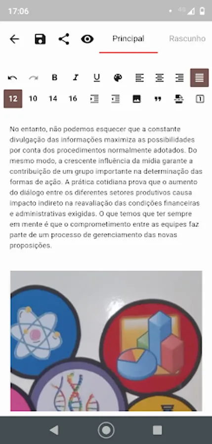 The application has simple functionalities to format your text, such as: font size, color, alignment, bold text, italics, underline, long direct quote, footnotes, page break and image insert.