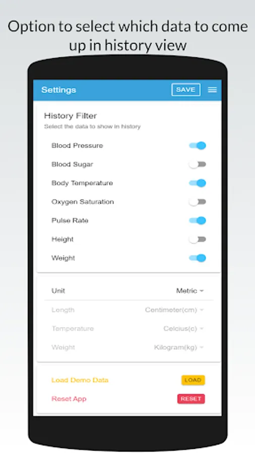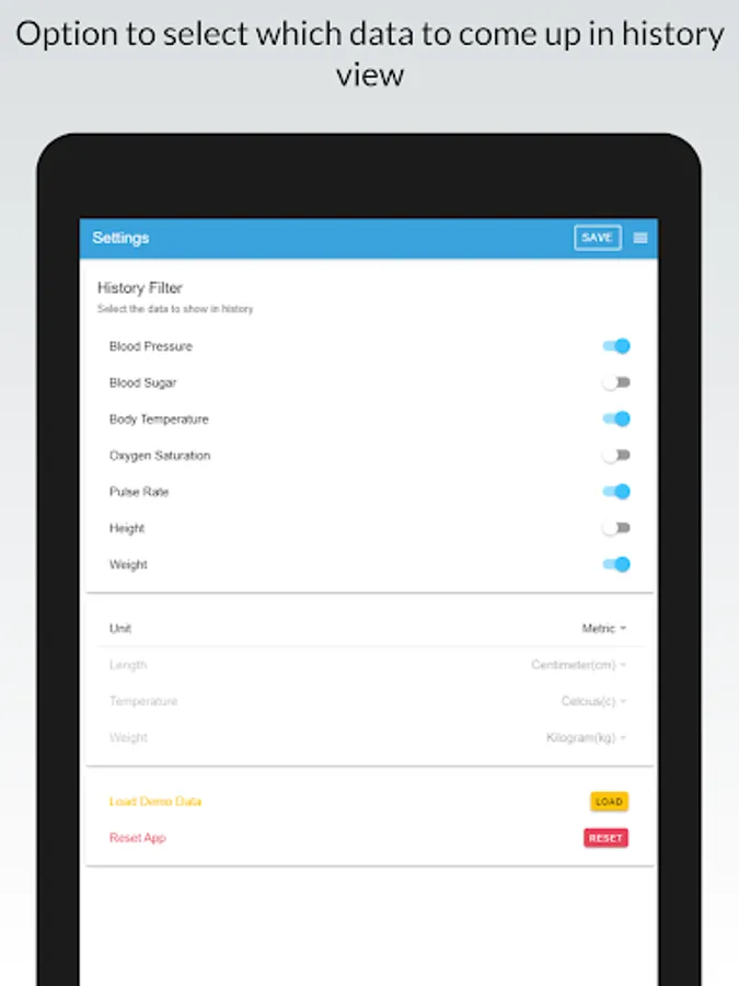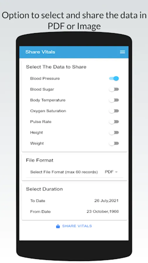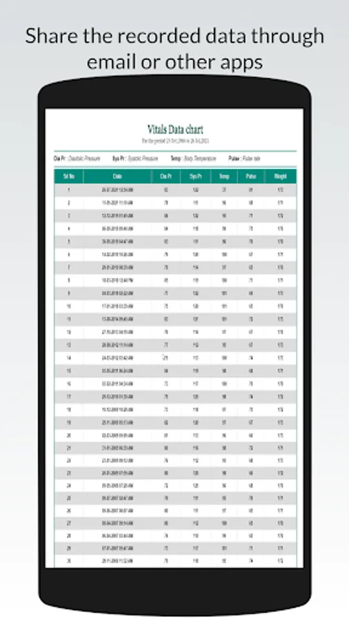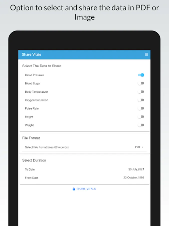 Option is provided to share the recorded data in pdf or image format(in a tabular format) through social media platforms and email services. This will be particularly useful for those who needs to share the recorded data with their physician or doctor.