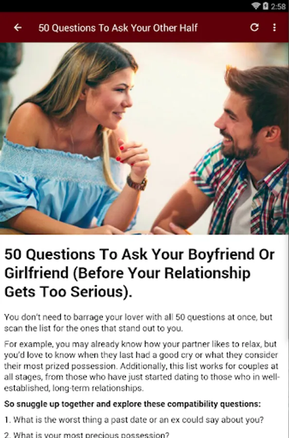 Don’t let any questions annoy you and don’t ever clam up or go on the defensive. Remember, the answers to these questions should be truthful and help both of you understand each other better. And by the time you’re done with the questions, you’d know more about each other and would also understand each other’s approach to life too.