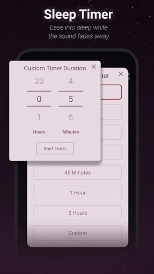 - Schedule a Sleep timer of your choice (as long as you want) or choose from presets. The sound fades away towards the end and the sound stops automatically.