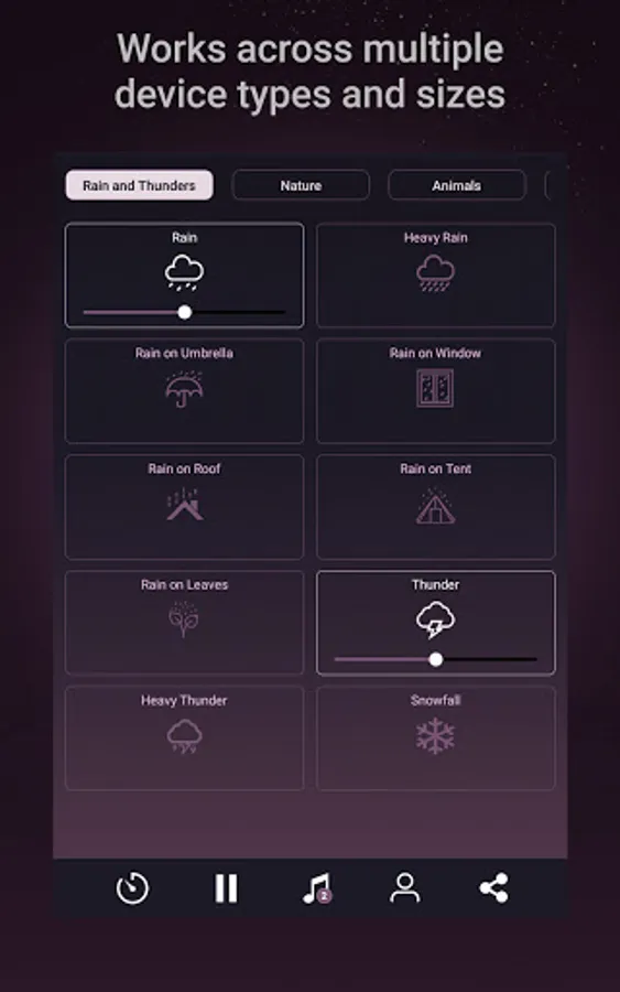 - Rain sounds: Light Rain, Heavy Rain, Rain on Umbrella, Rain on Window, Rain on Roof, Rain on Tent, Rain on Leaves, Thunder, Snowfall