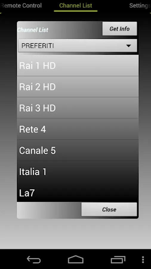 After choosing the channel by pressing the Get Info button displays the description of the program broadcast on the selected channel by pressing Return will return to the channel list. Close button closes the channel list.