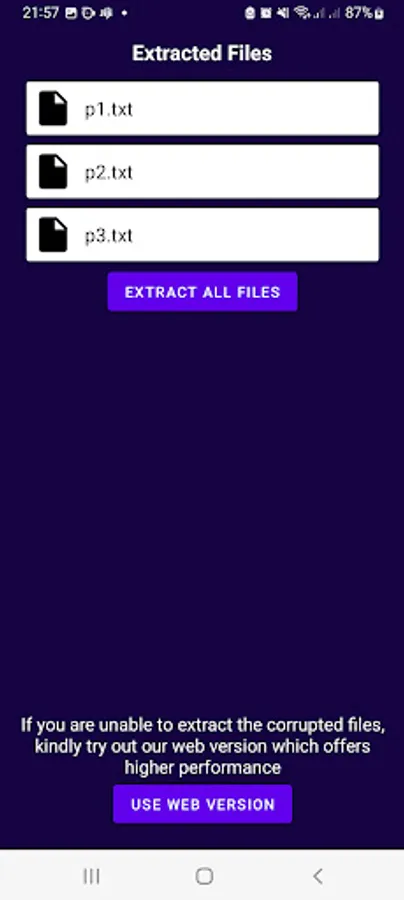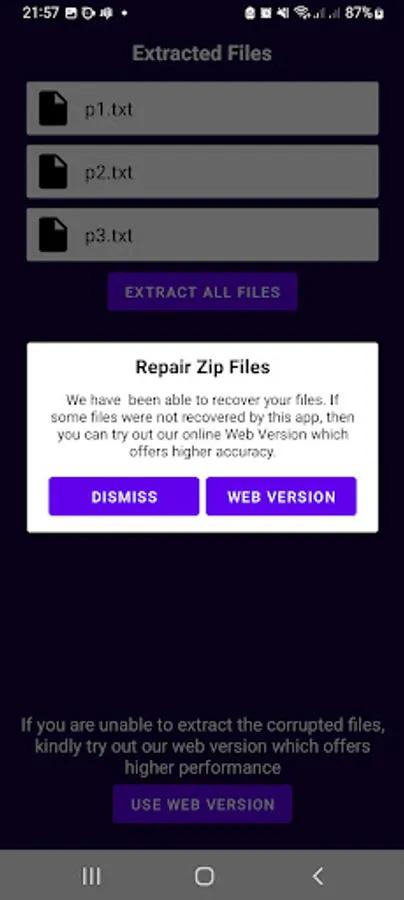 Repair and recover your files from a corrupt .zip file easily and for free. All you just need todo is to select the zip file and the app would process the archive file and produce your content all data.