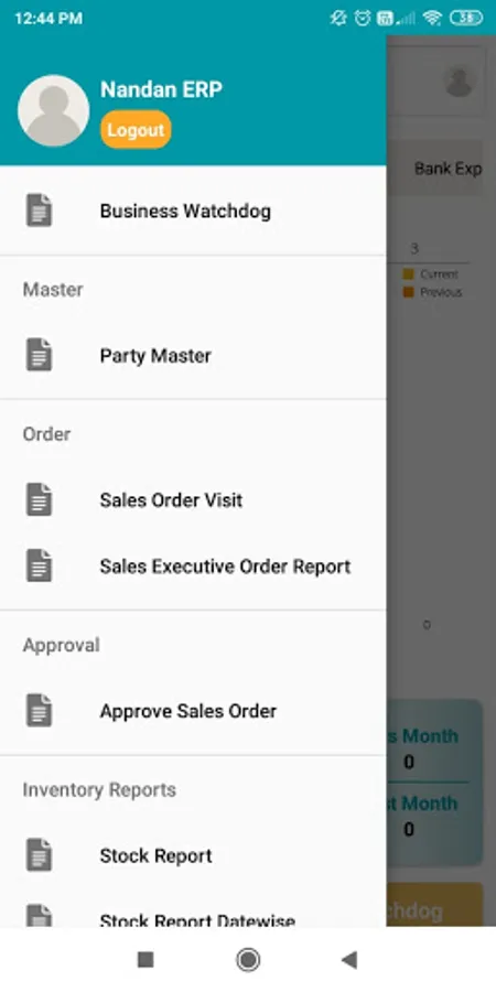 In this Application show multiple options Business Watchdog, Party Master, Sales Order Visit, Sales Order Report etc forms.