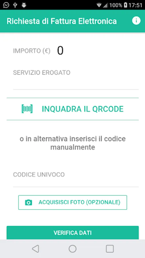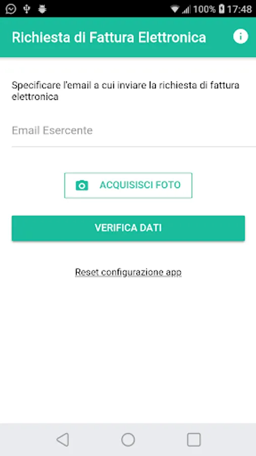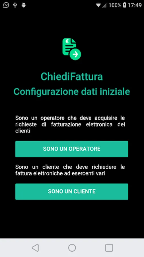 The AskFattura App! provides an initial configuration aimed at specifying their company data and the email of their administrative offices to send the e-invoicing request.