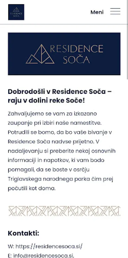 Residence Soča is located in a small alpine village named after the Soča River. The village of Soča lies in the Trenta valley, in the heart of the Triglav National Park, halfway between Bovec and the village of Trenta. The first inhabitants settled here in the 13th century, but today, according to the latest data, only about 140 people still live here. The Soča is a place where you will find true peace in the embrace of unspoiled nature. Just a few steps away from Residence Soča, the famous Soča Trail winds its way, offering unforgettable views of the emerald alpine beauty. You will especially enjoy crossing the picturesque suspension bridges, discovering the turquoise green pools and listening to the birdsong of the Triglav National Park. From Residence Soča you can go on foot for many longer or shorter hikes. The conquered peaks will offer you views that will reveal densely planted mountains and branching valleys carved by the Soča River and other alpine streams. You are invited to visit our website www.residencesoca.si, where you can read about the sights in the village of Soča. You will also find useful tips for spending free time in our immediate vicinity. We are always available at the reception for all information and ideas.