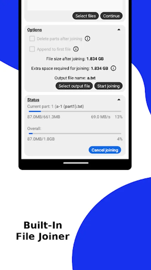 - Low device storage: Download a part of the file -> Move it to some storage space -> Download next. After completion join them using the free file joiner (available for Windows, Linux & Mac and is inbuilt on HTTP-Downloader)