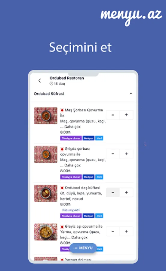 Menyu.az meal order service offers you fast and convenient delivery of a variety of dishes and desserts.