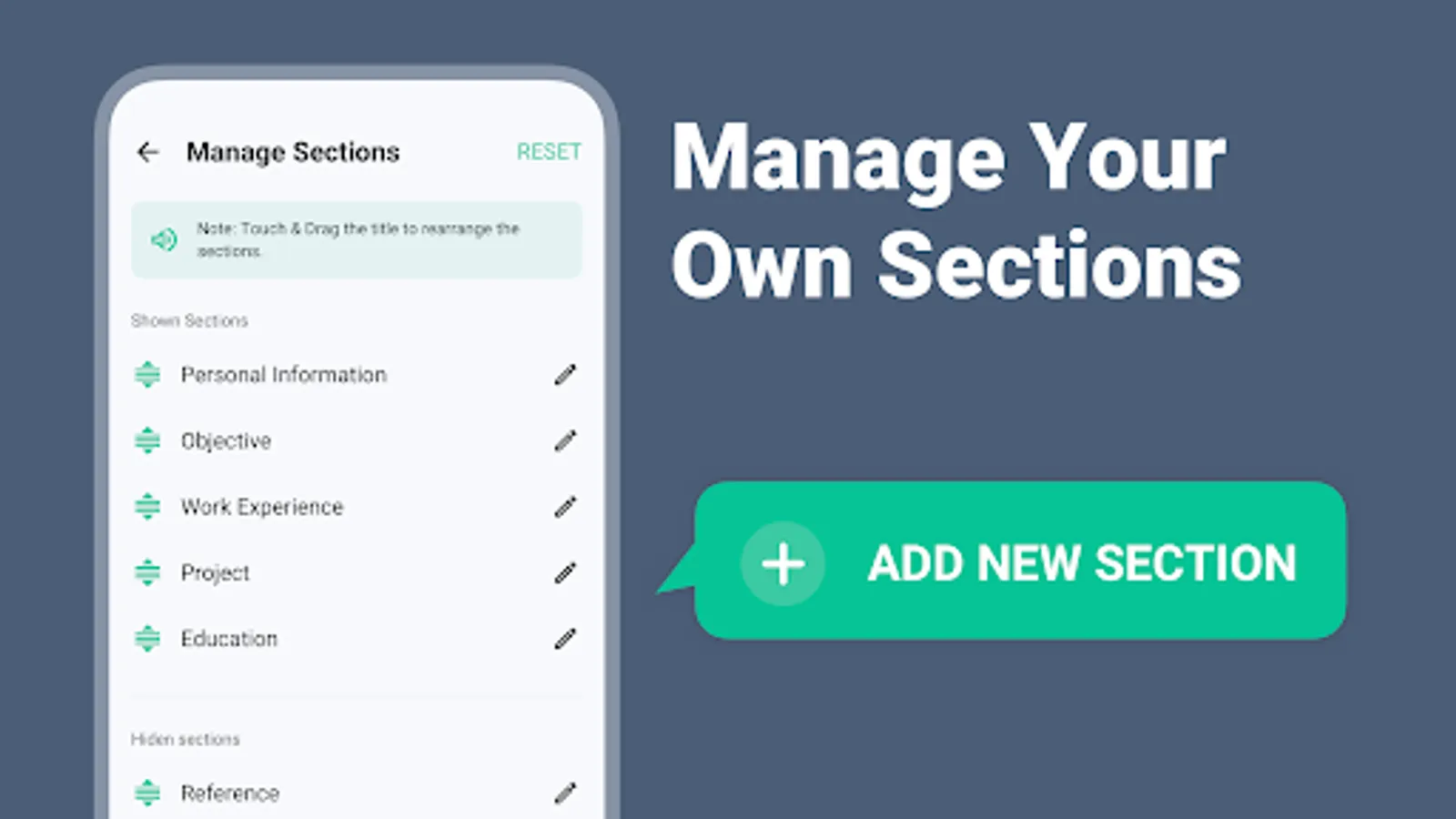The resume builder free allows you to personal pictures, website, etc. to edit resume & curriculum vitae. You can add custom information in every section and edit resume section as you like.