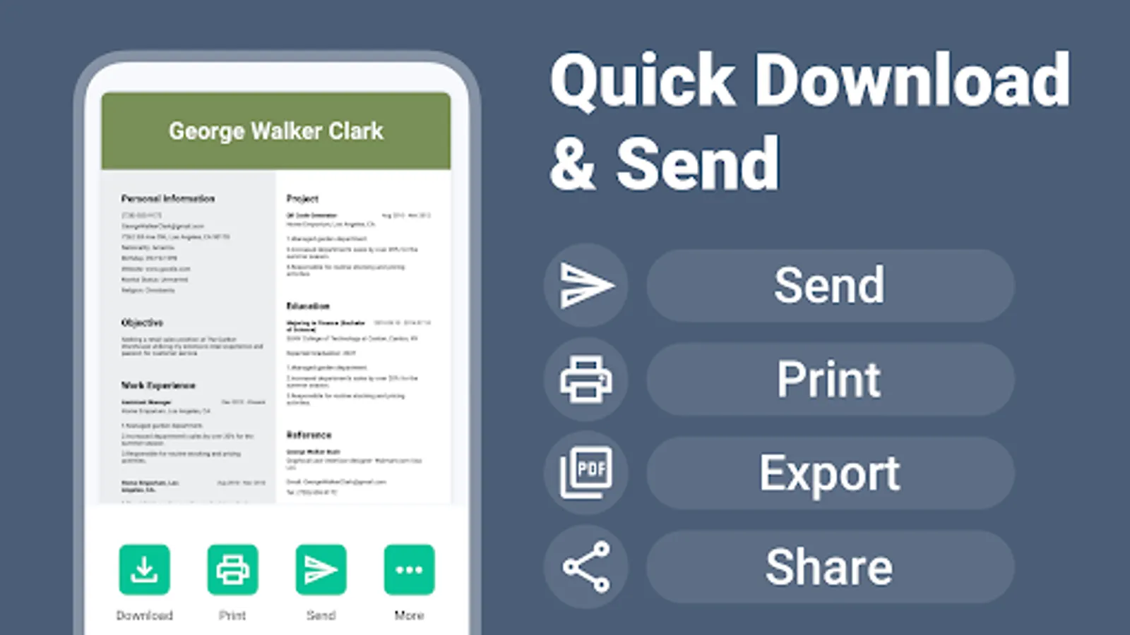 Send the build resume to the hiring manager directly to win more job interviews freely. Easily export resume to PDF, images. Directly print build resume free with one tap at anywhere, anytime