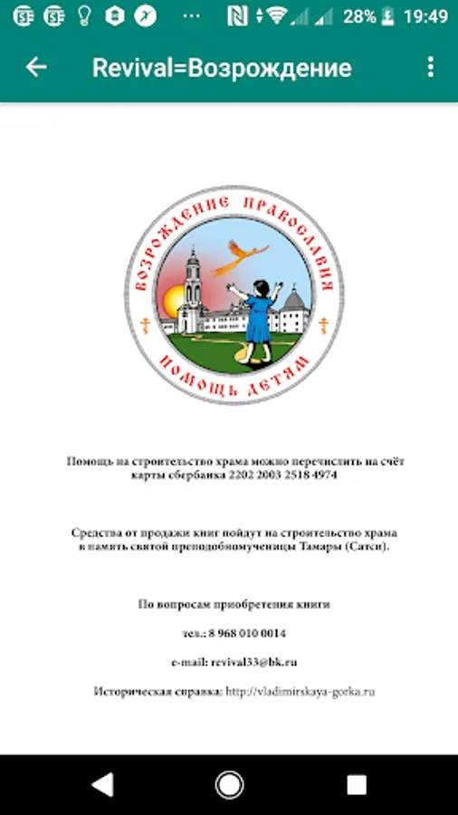 Revival is a book not only about the holy martyr Tamara (Satsi) and her relatives, it is also a book about goodness. Throughout her life, mother lived in monasteries, restoring and setting up holy monasteries, in which the feat of monastic life was combined with the education of orphans and medical aid to the infirm, and the love of God, expressed in constant prayer, was combined with active love for others. Today, a century after those events, let us, successful businessmen, try to do good, to grow rich with good deeds, collecting our treasure - a good foundation for the future, because the only way to know God is kindness. Downloading a book on Google Play, you are helping to build the church of the Vladimir Icon of the Mother of God. O.Labutova, a member of the Union of Journalists of Russia.