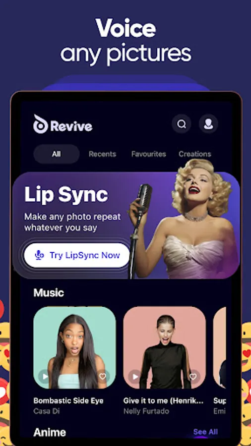 Revive is an animation creator. Using this photo animator you can easily make your face dance. It offers a handpicked selection of animation & funny video for pictures. Animate pictures to funny videos and make them stand out with a variety of trendy effects and sing like Monroe, Queen, Rihanna etc. You can also create cartoon animation with the meme maker option! Bring to live your boring avatars using AI video Generator!