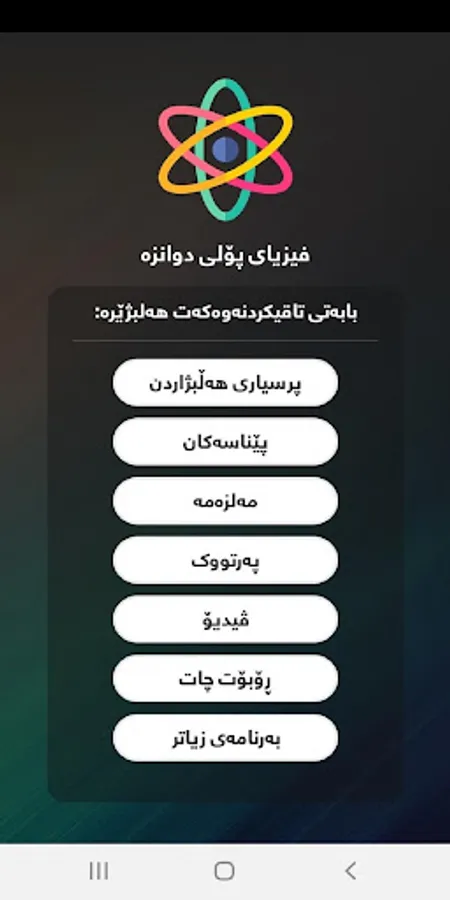 ئەم پرۆگرامە تایبەتە بە بابەتی فیزیای پۆلی دوانزەی زانستی کە پێک دێت لەم بەشانەی خواەرەوە: