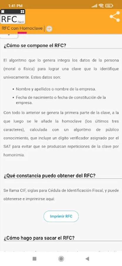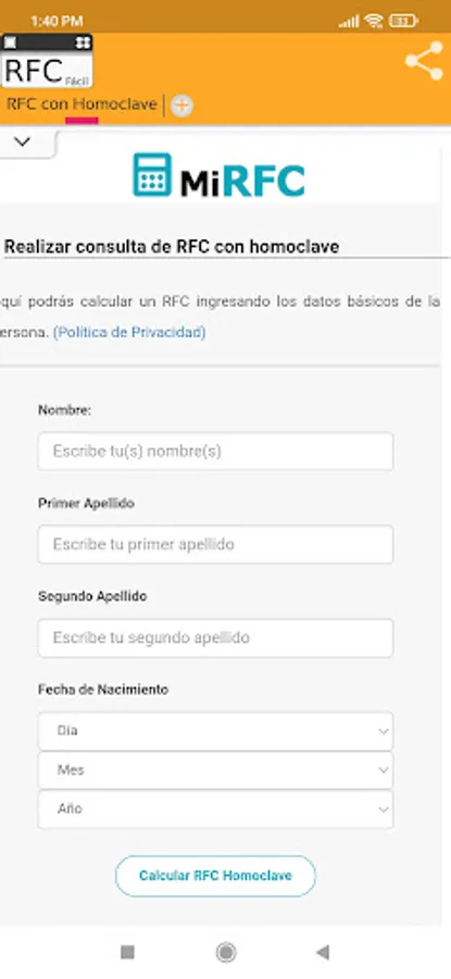 In this app you will be able to calculate your RFC with homoclave, entering your basic data, the result is valid for natural persons who have already generated their procedure in the SAT.