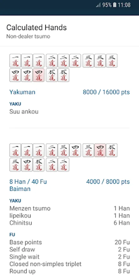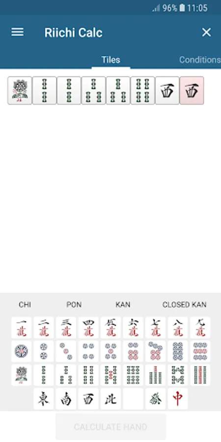 Riichi Calc is an easy to use app that takes any valid Japanese mahjong hand and calculates all possible winning combinations. A great companion for any Japanese mahjong player! Feel free to e-mail me about any calculation errors.