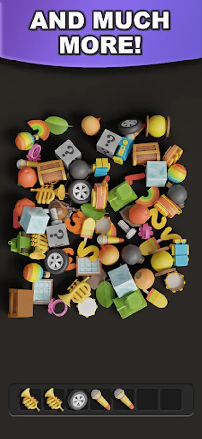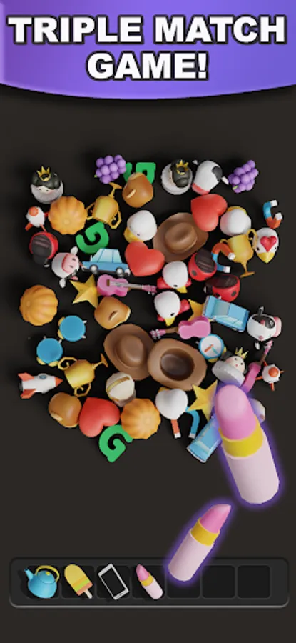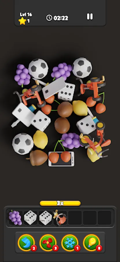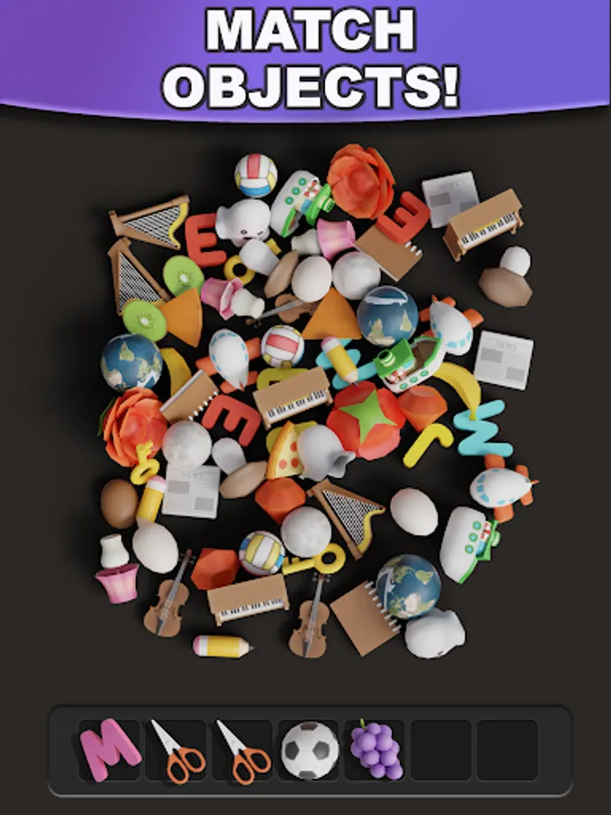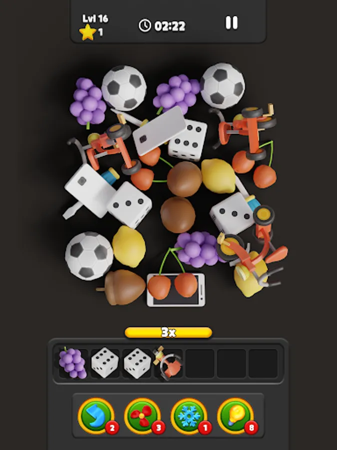 Choose two same objects from randomly placed items! Within limited time, clear all items, pass levels and collect more rewards.