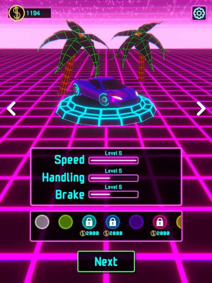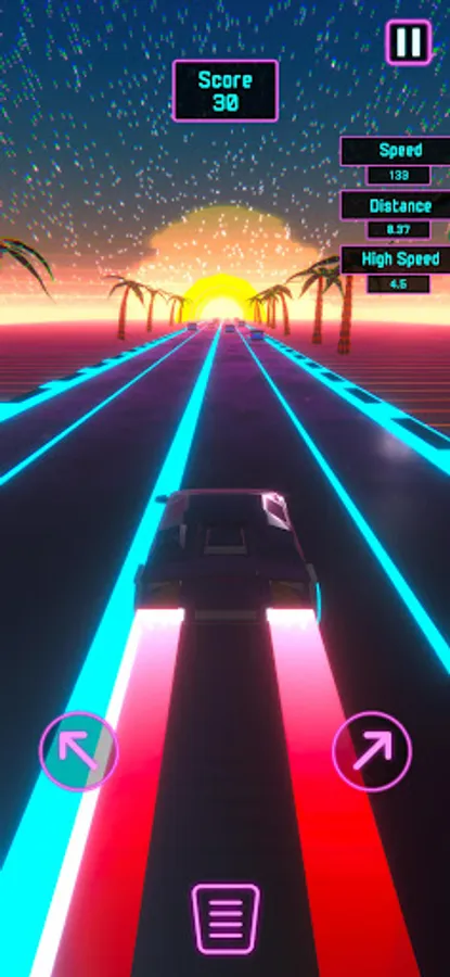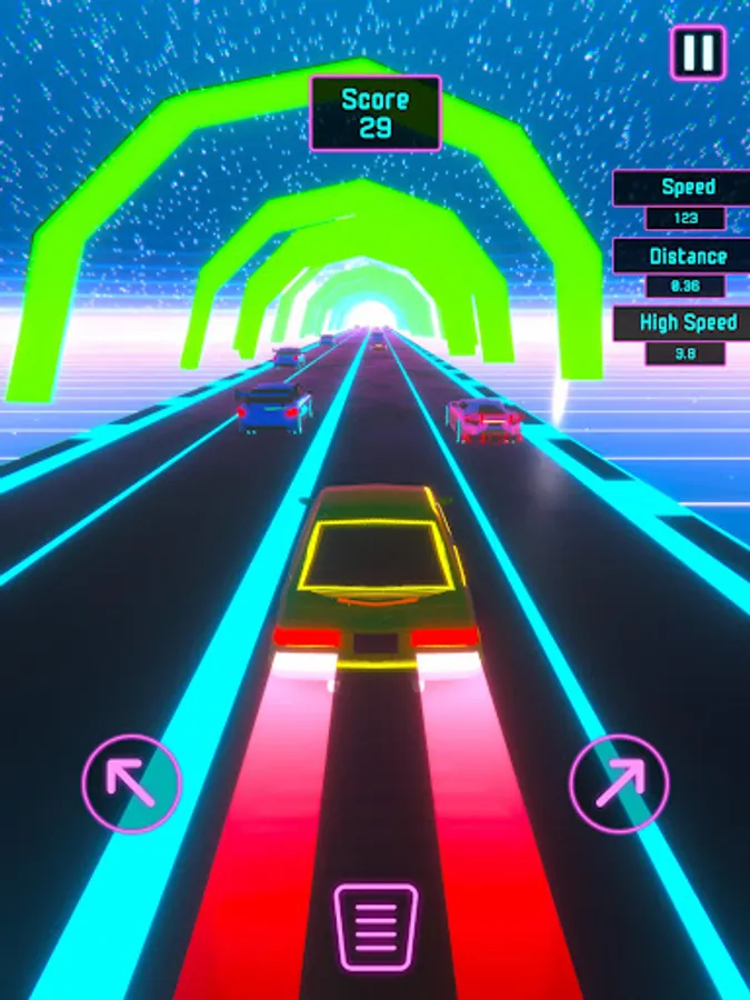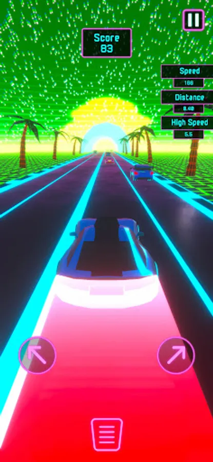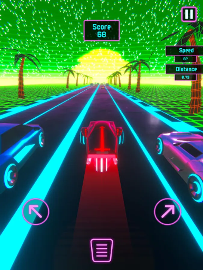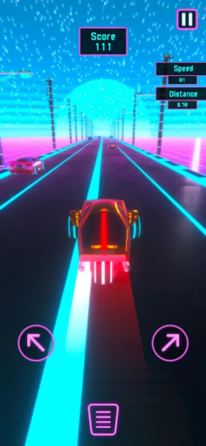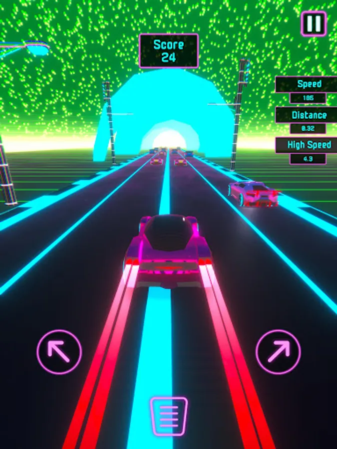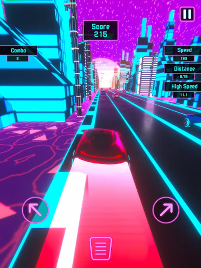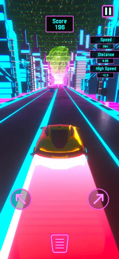 Seamlessly steer your way through the neon-lit lane by tapping left and right. The unique dynamic acceleration system ensures your car gains momentum at the perfect speed, eliminating the need to press a gas pedal. And when precision is key, tap the center to engage the brake pedal and skillfully slow down.