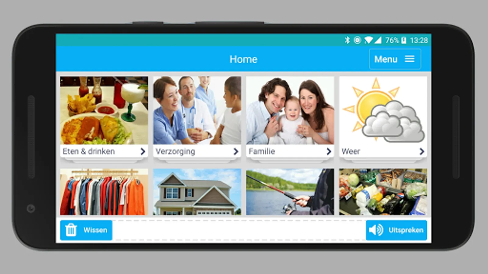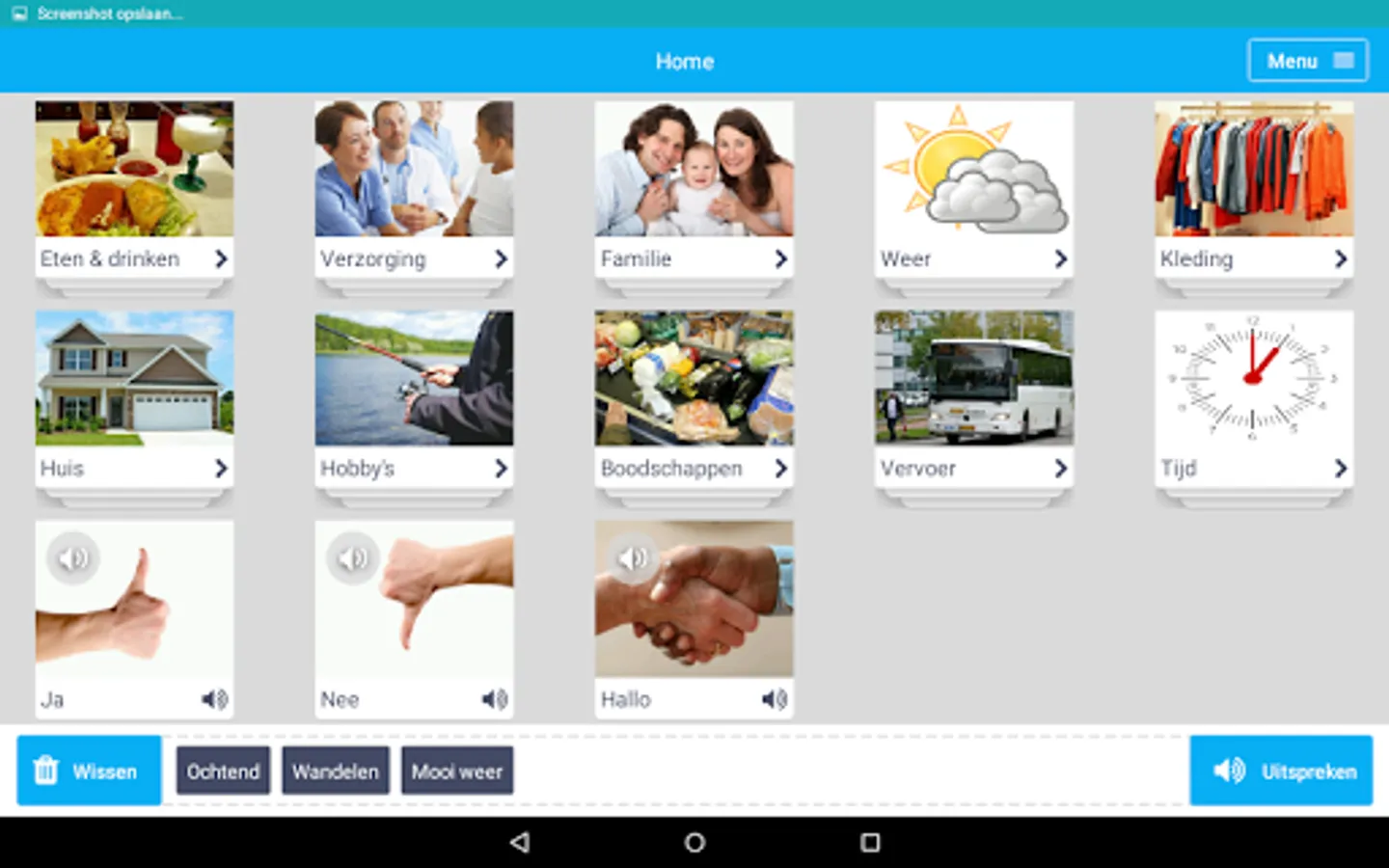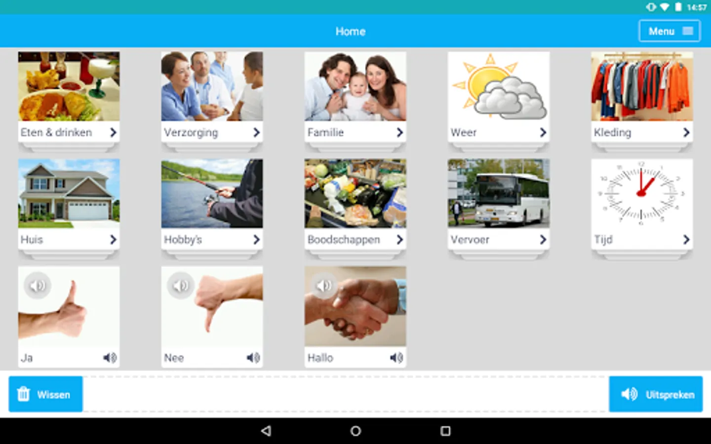 Express Me is an app that helps people with speech difficulties to communicate in daily life. Through words tiles category, the user can look up words and be spoken by the app. It is possible to manually add words and categories to the application.