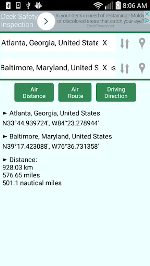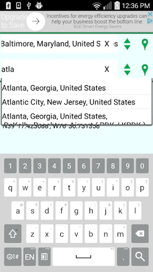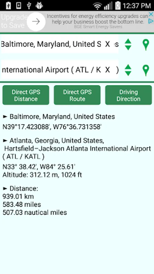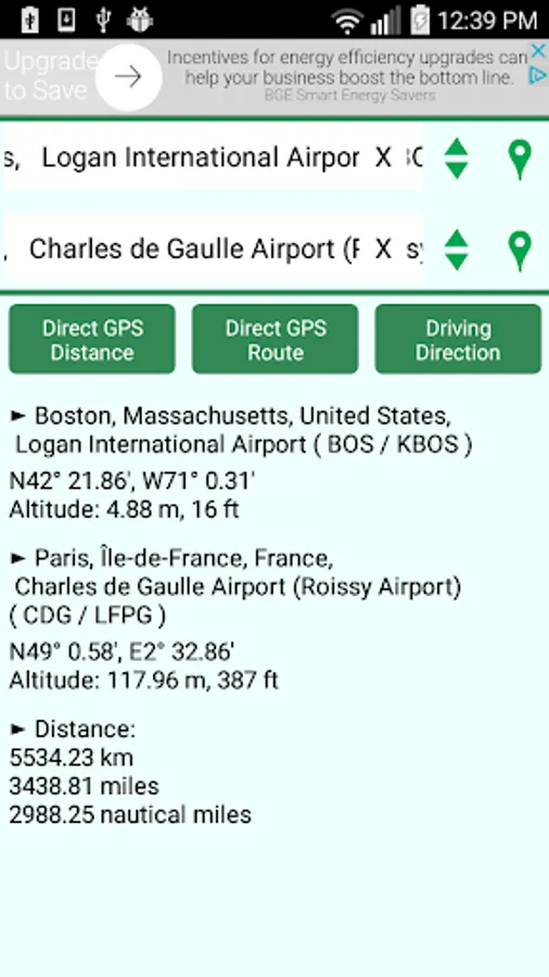 The direct GPS route represent the shortest distance between the cities and/or airports.