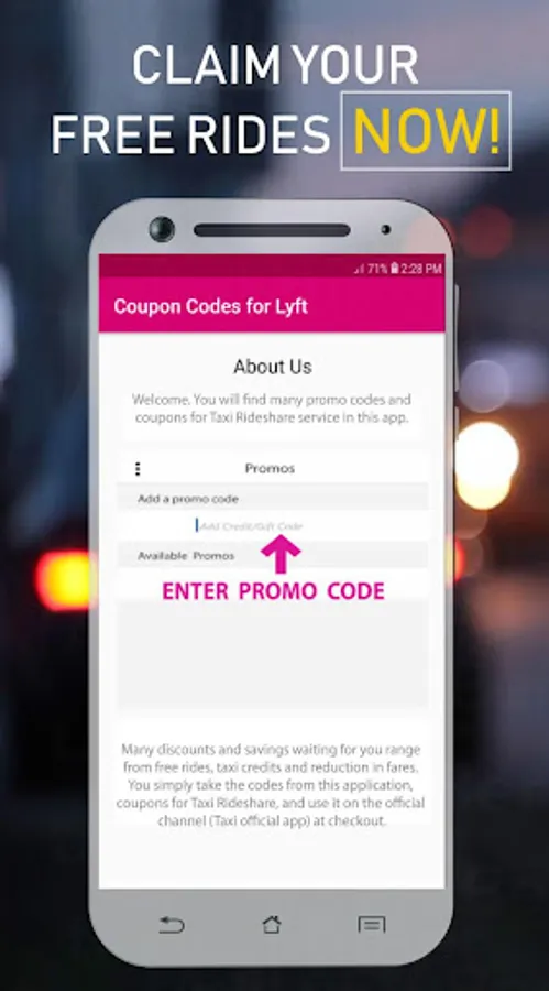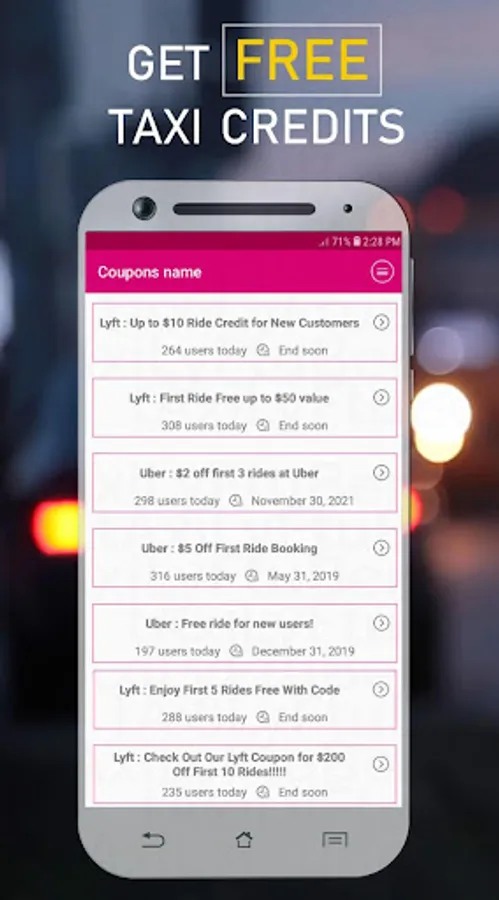 Taxi Rideshare coupons promo codes for Uber and Lyft is a mobile application in which you just download in your cellphone and find promo codes and coupons for rideshare taxi including Lyft and Uber. Thru, its official app, you can request the taxi uber / Lyft rideshare service anytime. The driver will pick you up at wherever you are. You will make payment once the ride is completed. This taxi rideshare Coupons promo codes app provides you with many discounts and savings for Uber or Lyft passengers. This ranges from free rides, taxi credits and reduction in fares. You simply take the codes from this application and use it on the official channel like Uber and/or Lyft.