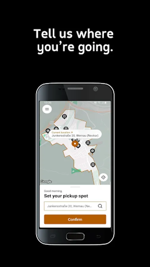 Your FlexMobil is "on call" for you. In the evening, it supplements the existing bus lines in Wernau. You get on and off the bus at fixed stops. This can be a bus stop or a individual stop such as an intersection or a tourist attraction. The app automatically navigates you to one of the many stops in the city. For each booking, the optimal boarding point near your starting point is picked out.