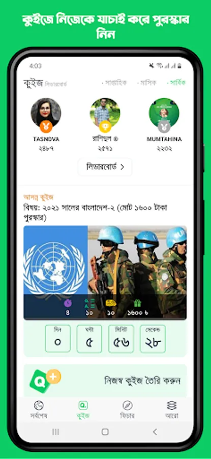 নিয়মিত কুইজে অংশ নিন আর যাচাই করুন নিজেকে। কুইজে জিতে নিতে পারেন মোবাইল রিচার্জ পুরস্কার।