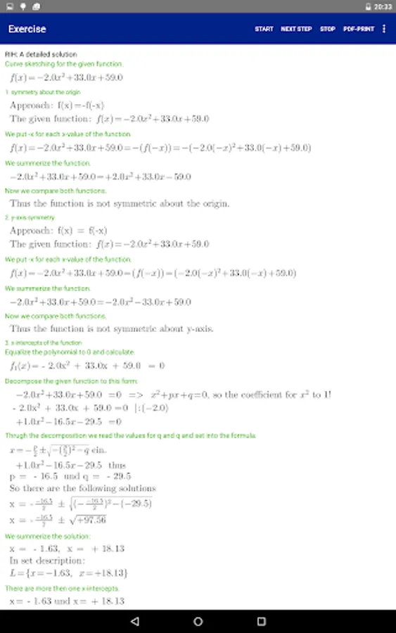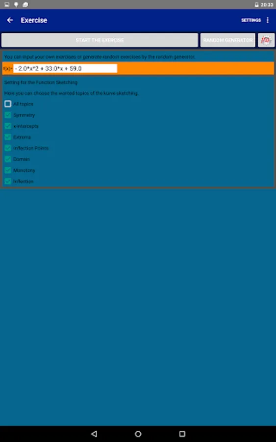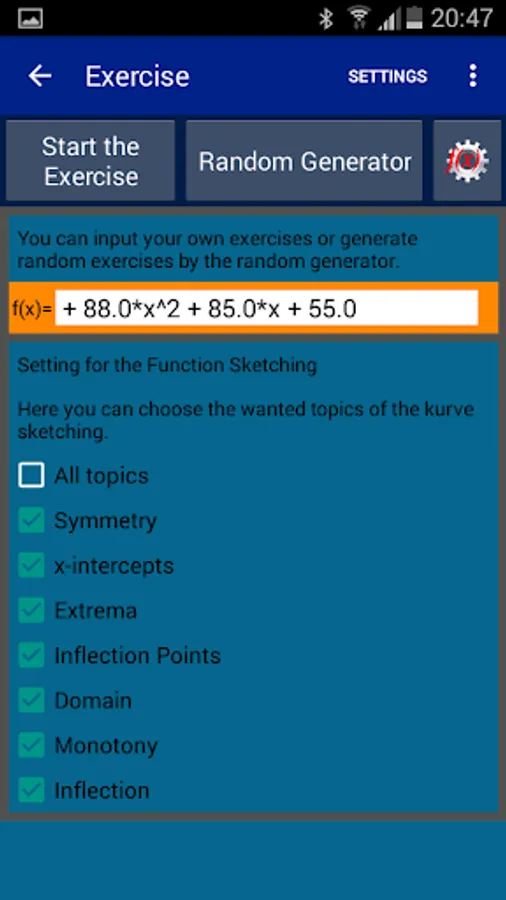 This app compute and demonstrate the steps to solve each exercise in kurve sketching (function analysis), which contains the null point calculation, the extremes, inflection points, saddle points, monotony, symmetry, concavity.
