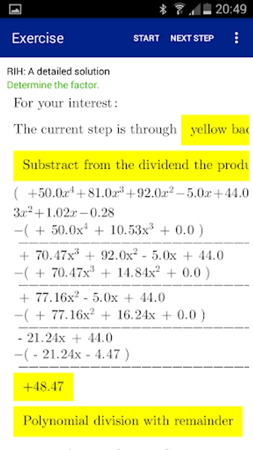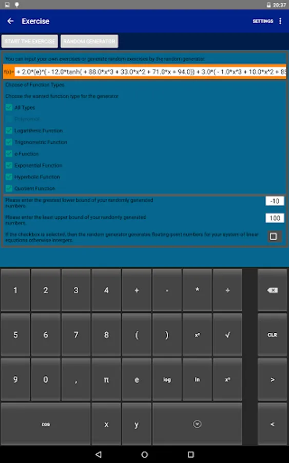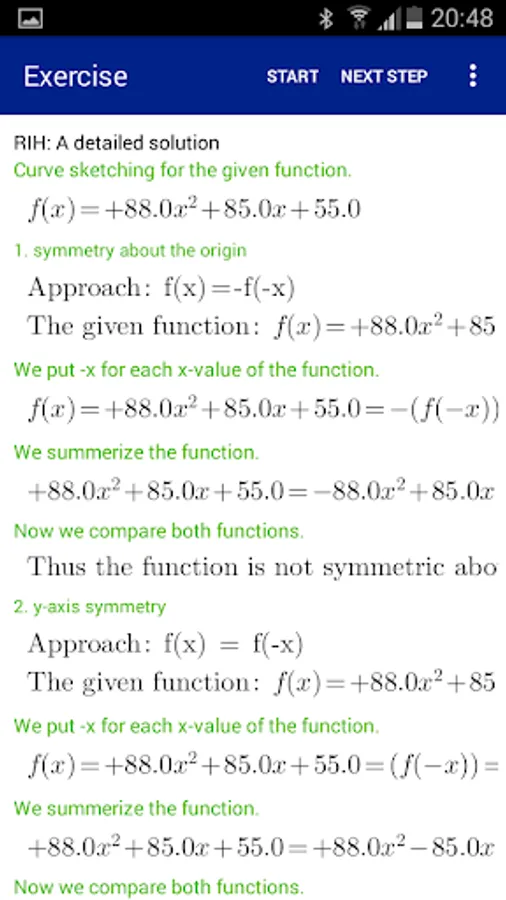 You can solve your math functions, homework, exercises und LEARN how to solve. This app demonstrate the solution of each exercise step by step. You can enter your mathematik homework or generate automatically an exercise and learn the solution way. The main aim of this app is to show you HOW to SOLVE an exercise.