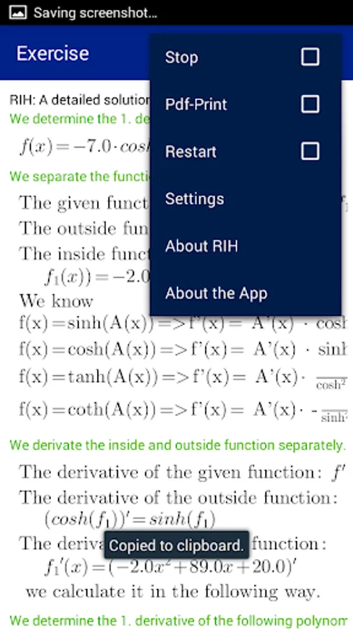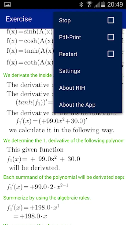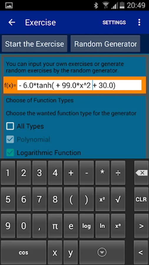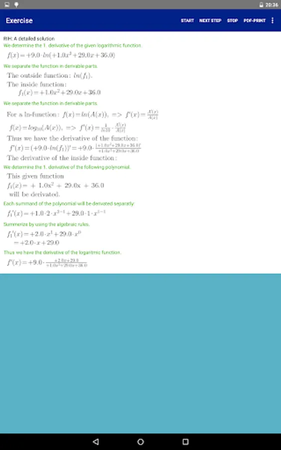This app contains an extra section for computing the derivations of all function types, so you can learn how to derivate a function step by step. You can enter your own exercise or homework or generate a function automaticaly.