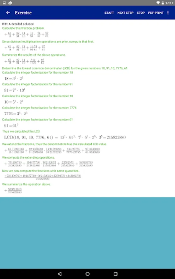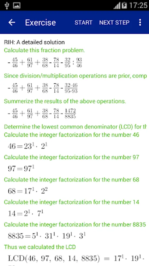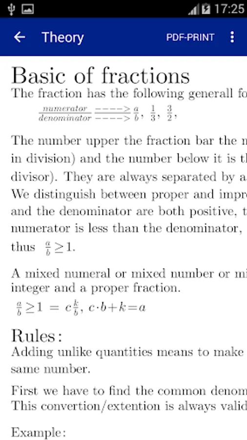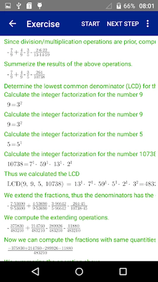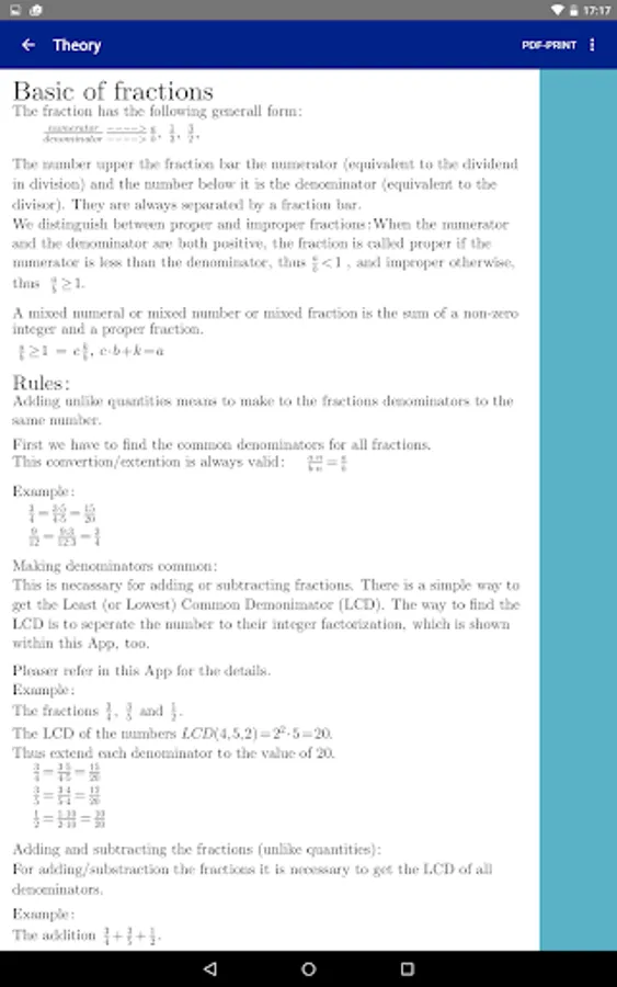 You can solve your fractions problems, exercises und LEARN how to solve them. This app demonstrate the solution of each exercise step by step. You can enter your mathematik homework or generate automatically an exercise and learn the solution way. The main aim of this app is to show you HOW to SOLVE an exercise.