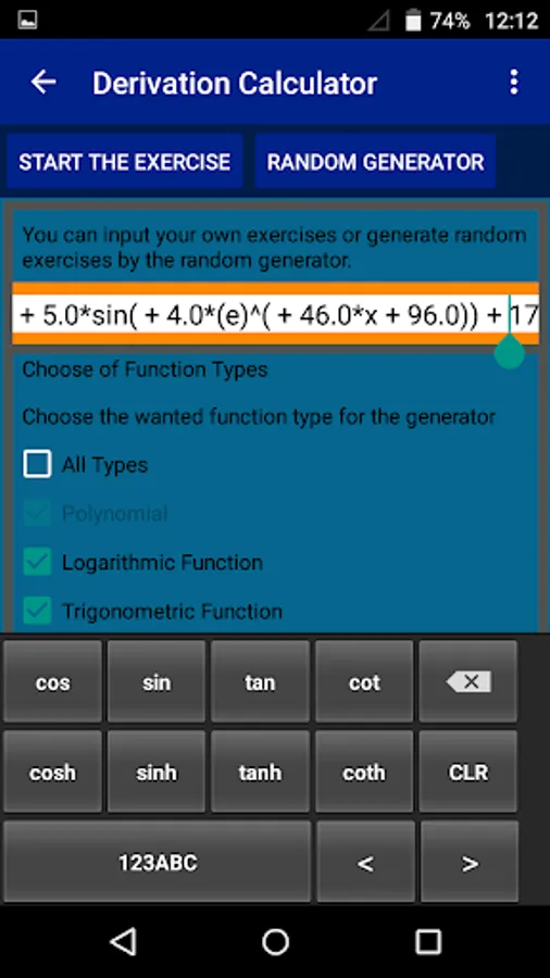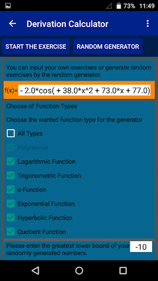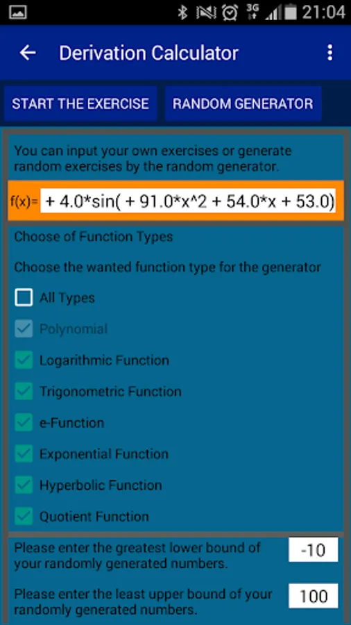 This App computes the derivations of all function types. You can enter your own exercise or homework or generate a function automaticaly.