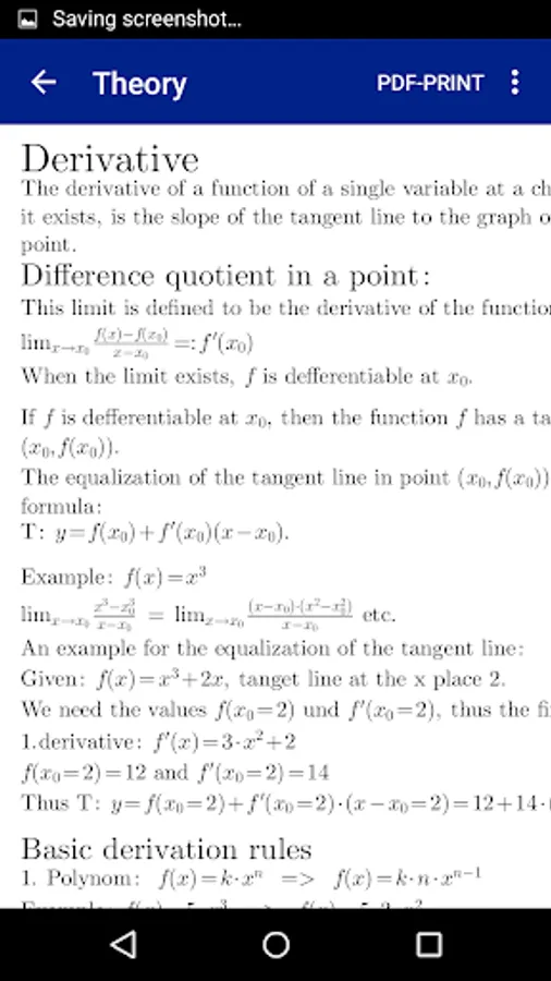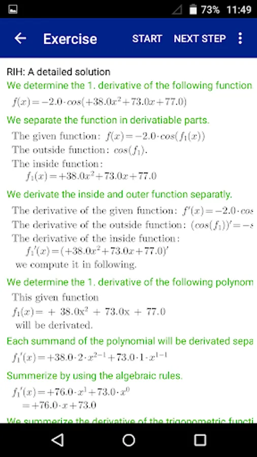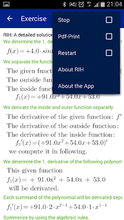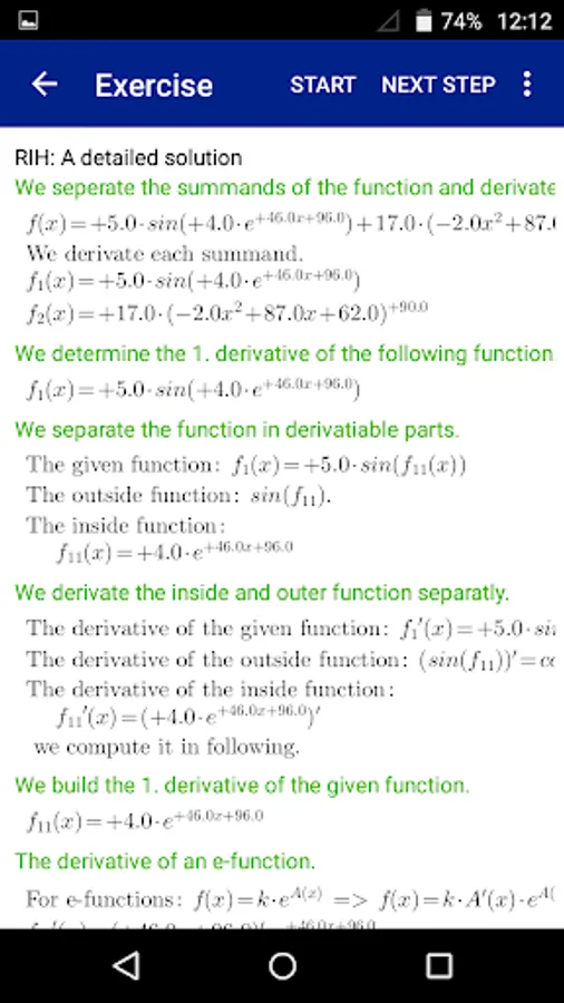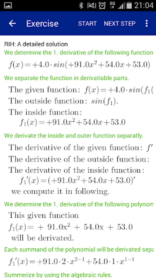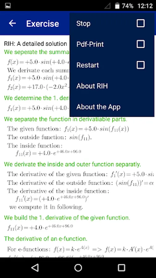 You can solve the derivatives of nearly every function, homework, exercises und LEARN how to solve. This app demonstrate the solution of each exercise step by step. You can enter your mathematik homework or generate automatically an exercise and learn the solution way. The main aim of this app is to show you HOW to SOLVE an exercise.