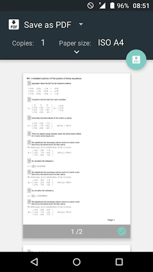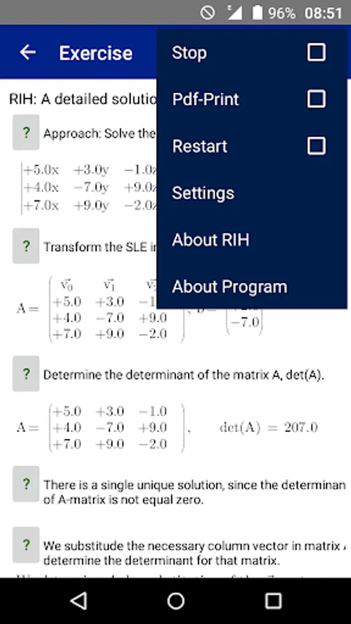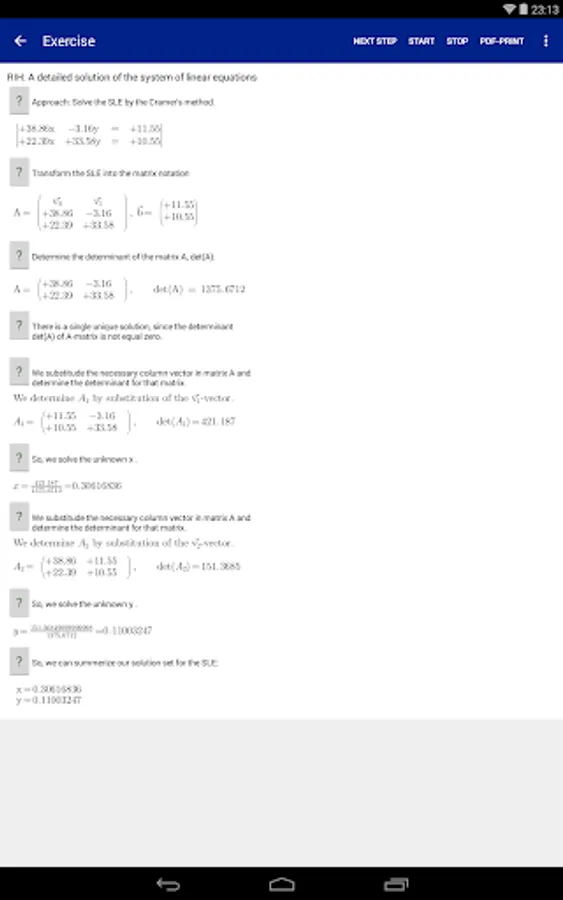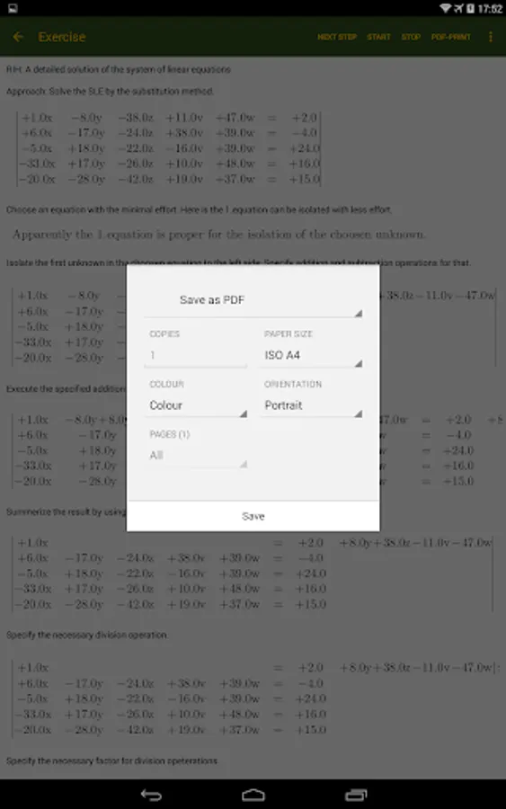 The student can print the solved Systems of Linear Equations to a pdf document. Only supported for Android version 19 and newer, Kitkat, (4.4).