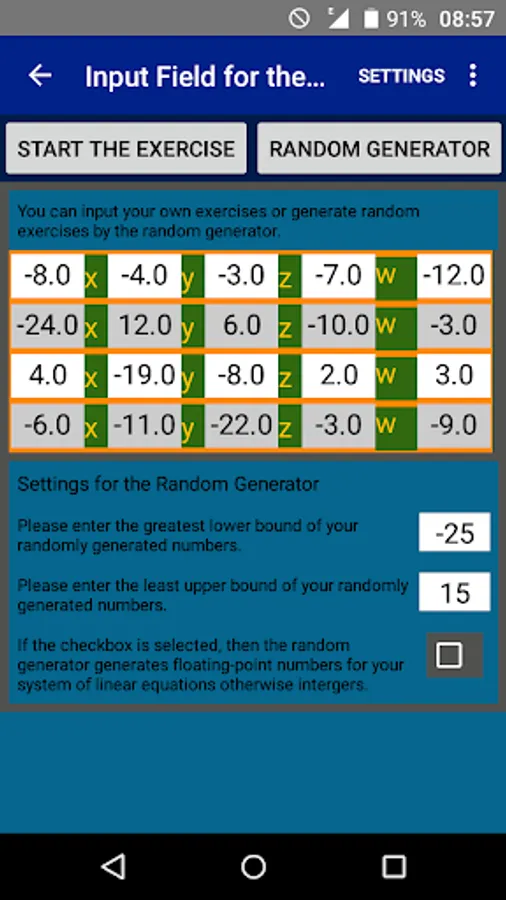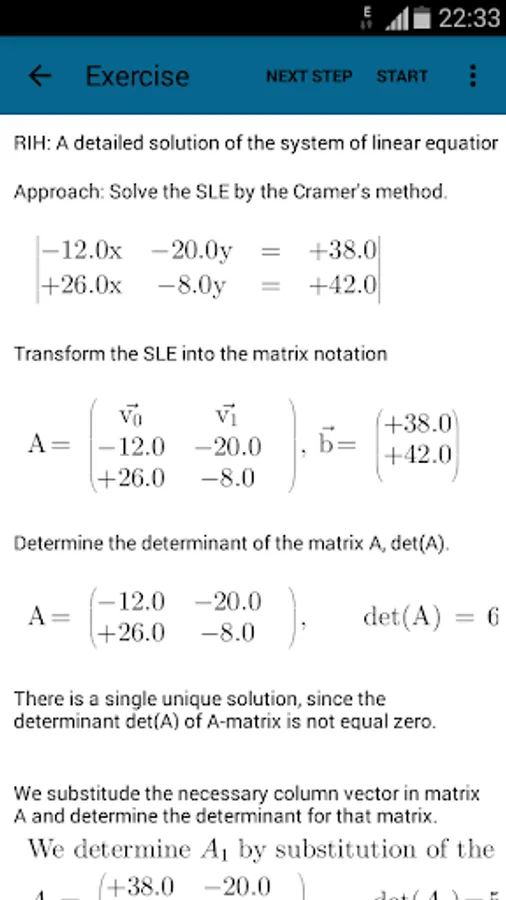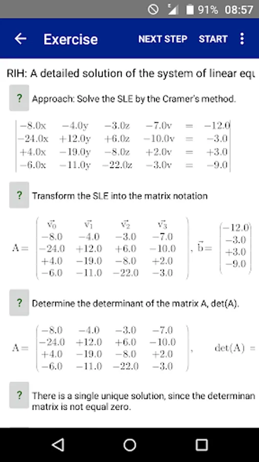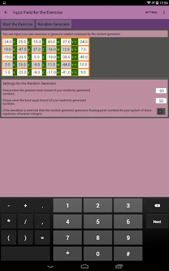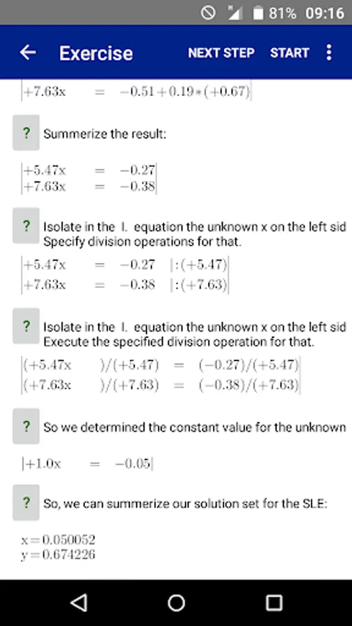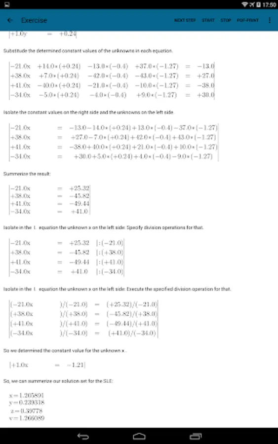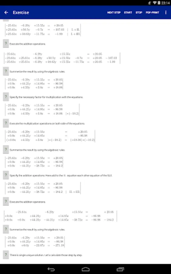 The user/student can enter his own Systems of Linear Equations or can generate Systems of Linear Equations by the integrated automatic generator engine randomly. Each Systems of Linear Equations can be solved (very detailled) with one of this solving ways:
