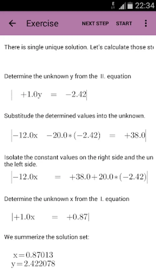 The tool shows step by step how to approach the solution of the Systems of Linear Equations.
