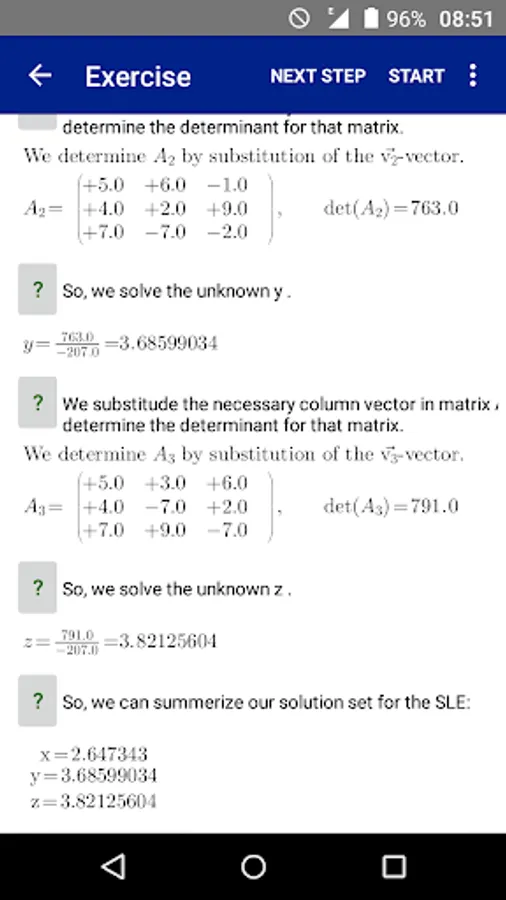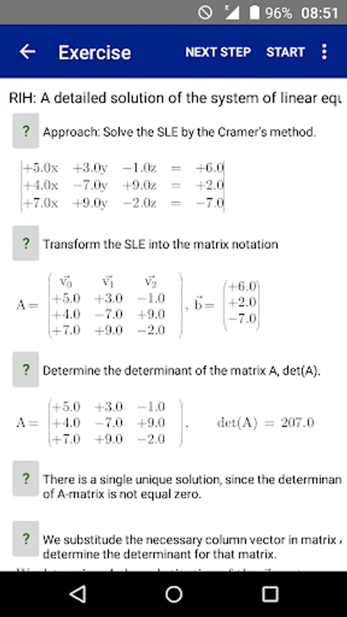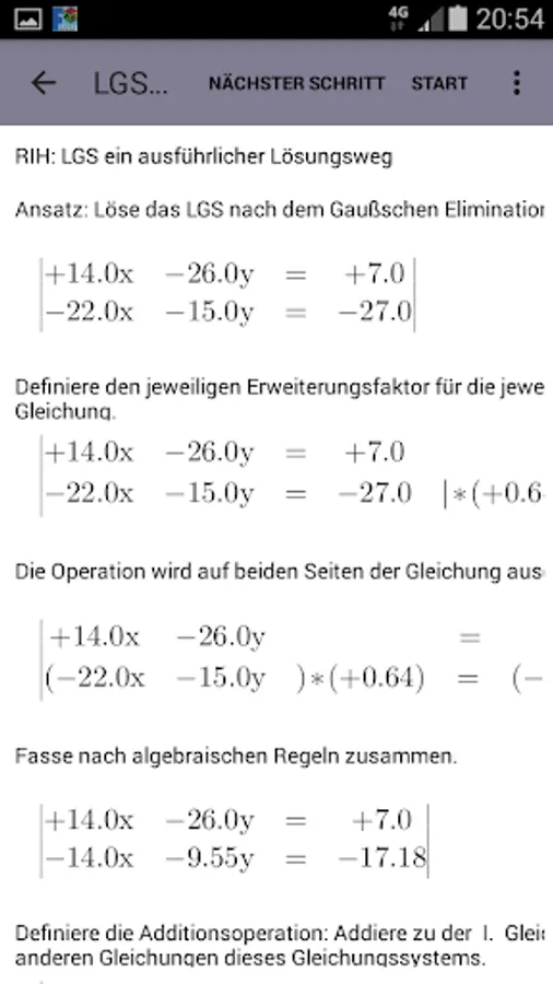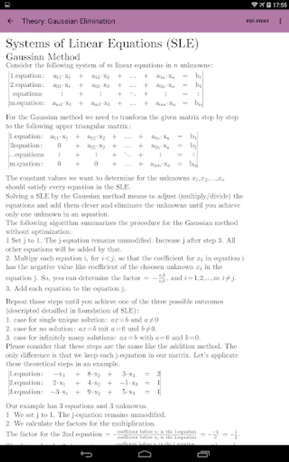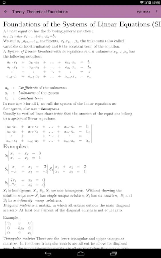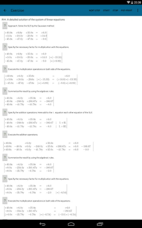 The user/student can enter his own Systems of Linear Equationsor can generate Systems of Linear Equations by the integrated automatic generator engine randomly. Each Systems of Linear Equations can be solved (very detailled) with one of this solving ways ın the full versıon. This lite version supports only two: