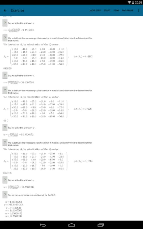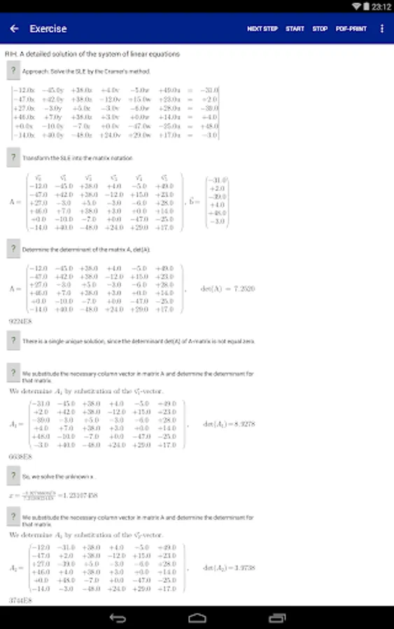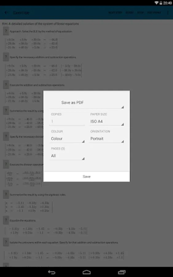 The student can print the solved Systems of Linear Equations to a pdf document only in full version. Only supported for Android version 19 and newer, Kitkat, (4.4).
