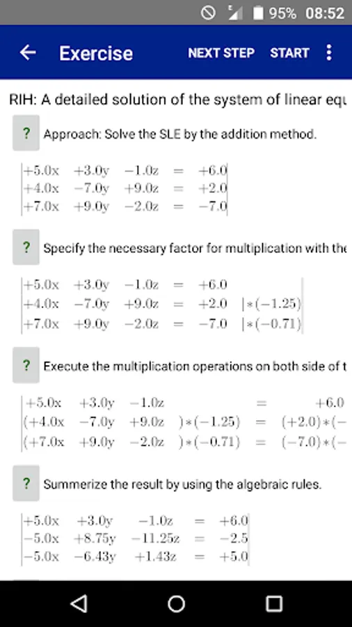 The tool shows step by step how to approach the solution of the Systems of Linear Equations.