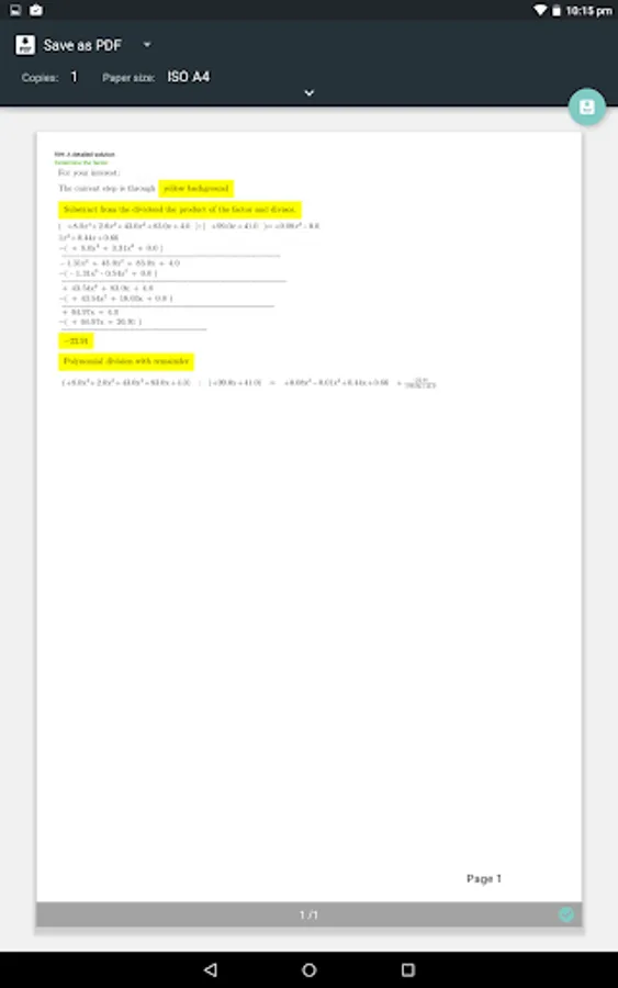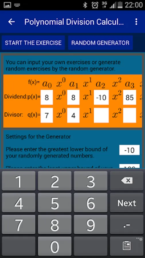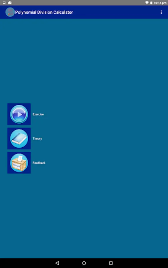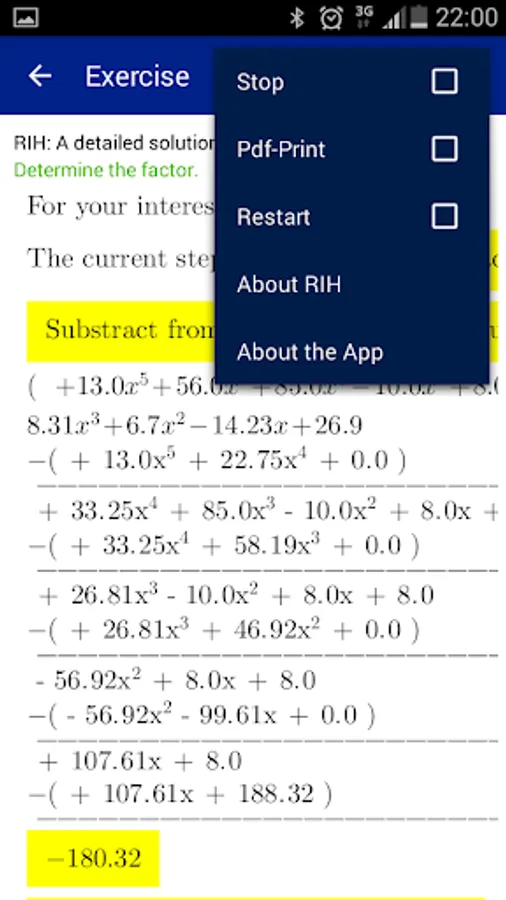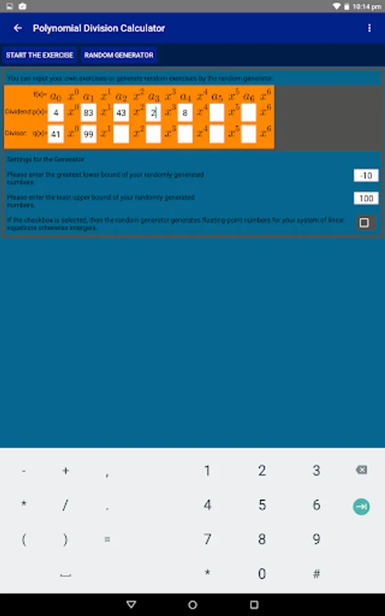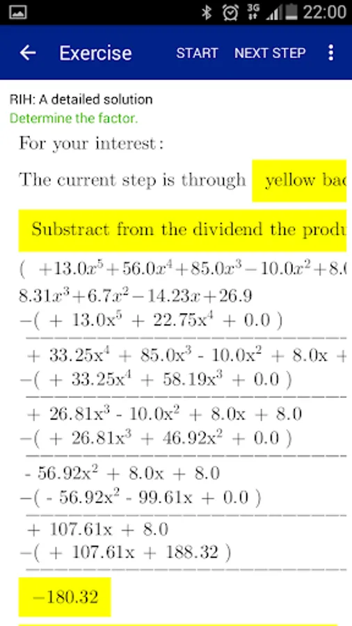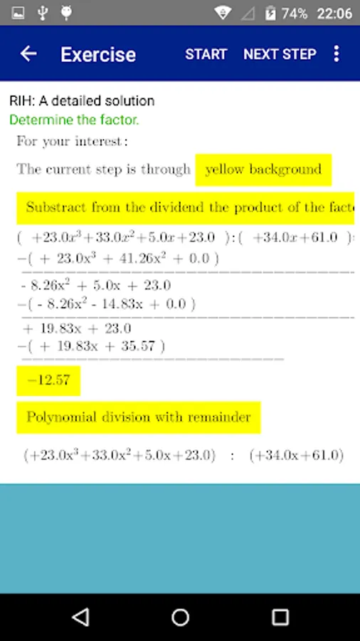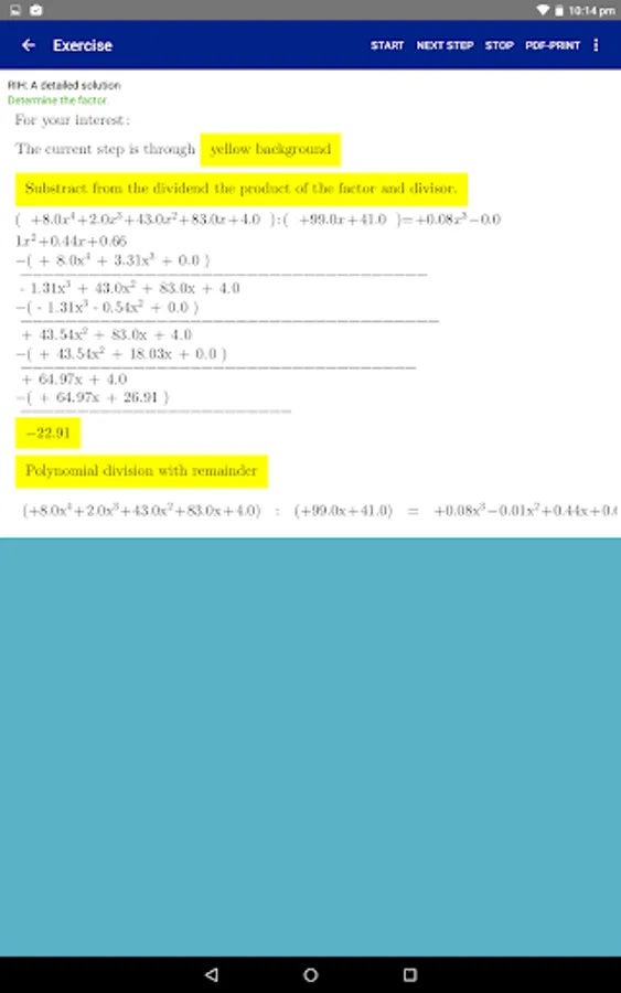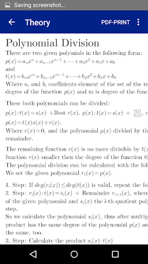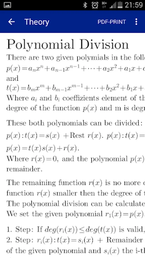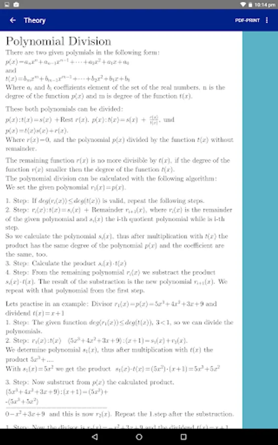 You can solve polynomial division. You can enter your homework, exercises und LEARN how to solve your problems. This app demonstrate the solution of each exercise step by step. You can generate automatically an exercise and learn the solution way. The main aim of this app is to show you HOW to SOLVE an exercise.