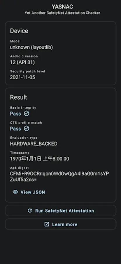 YASNAC (short for Yet Another SafetyNet Attestation Checker) is an Android app that demonstrates SafetyNet Attestation API.