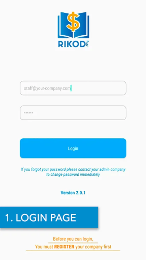 - Sebelum menggunakan aplikasi rikod.my, anda perlu daftarkan terdahulu login dashboard admin di Website www.rikod.my