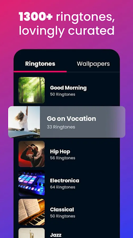 Finding ringtones will be easier than ever. Carefully chosen ringtones of 20+ categories in total with uniqueness and diversity: Most Popular, Classical, Rock & Roll, Vintage, Jazz, Hip Hop, Heavy Metal, Rhythm & Blues, Holidays, Good Morning, Country Music, Amusing Sounds, Cute Baby, Notifications, Alarms, Electronic Music, Lovable Animals…