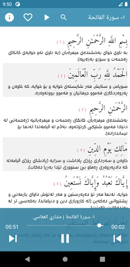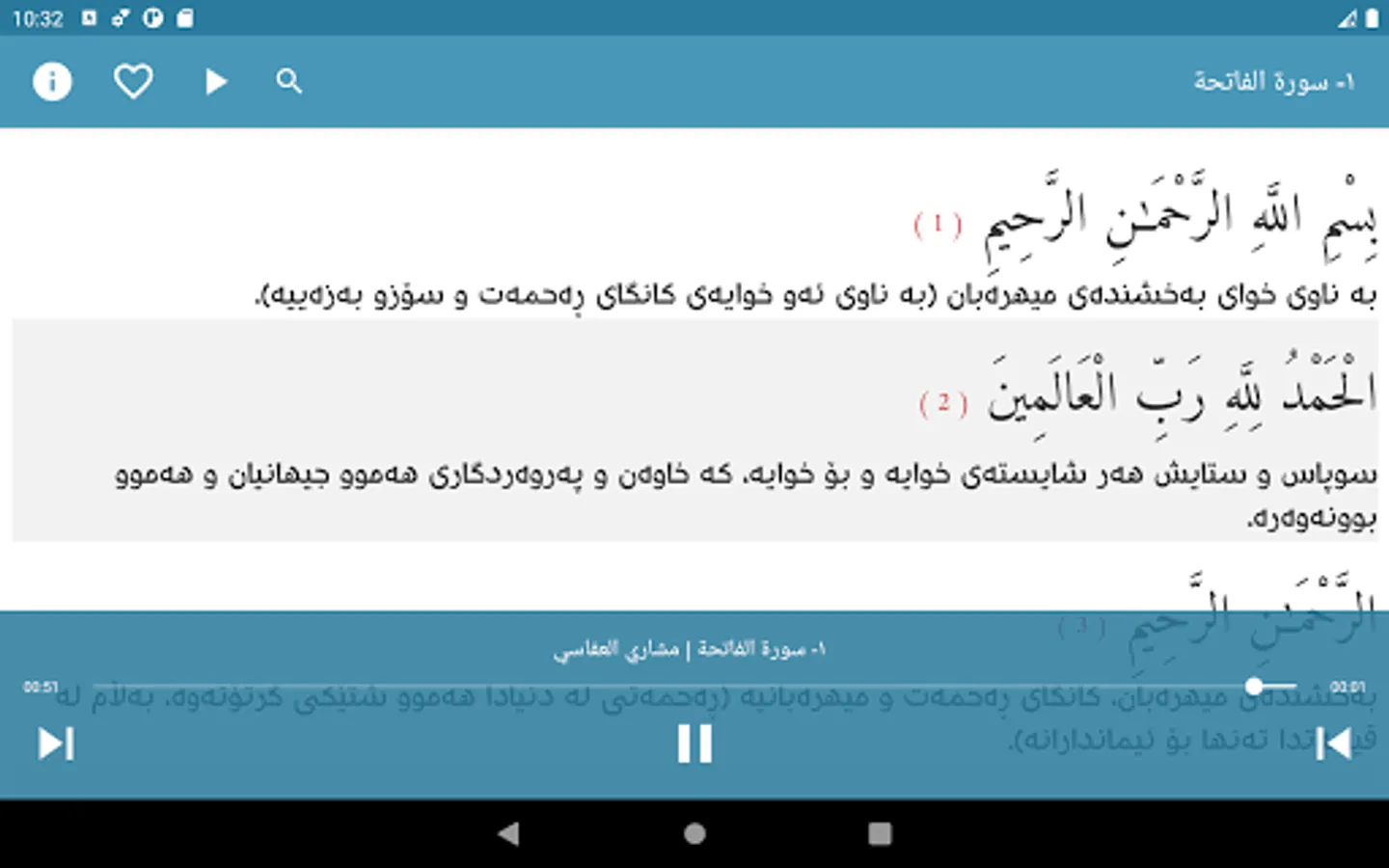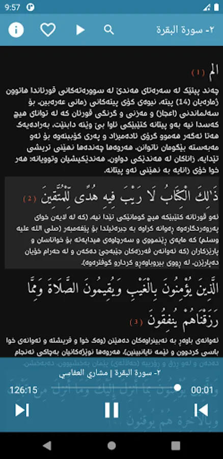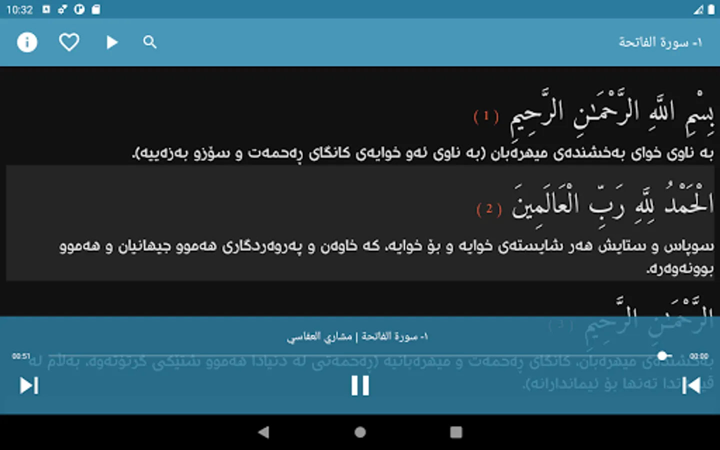 لەم پڕۆگرامەوە دەتوانیت تەواوی قورئانی پیرۆز بخوێنیتەوە و گوێی لێ بگریت لەگەڵ تەفسیری کوردی، وە دەتوانیت بە ئاسانی دەقەکان بڵاوی بکەیتەوە چ تەفسیر بێت یان ئایەت هەروەها دەتوانیت هەر بەشێك کە بتەوێت چاپی بکەیت.