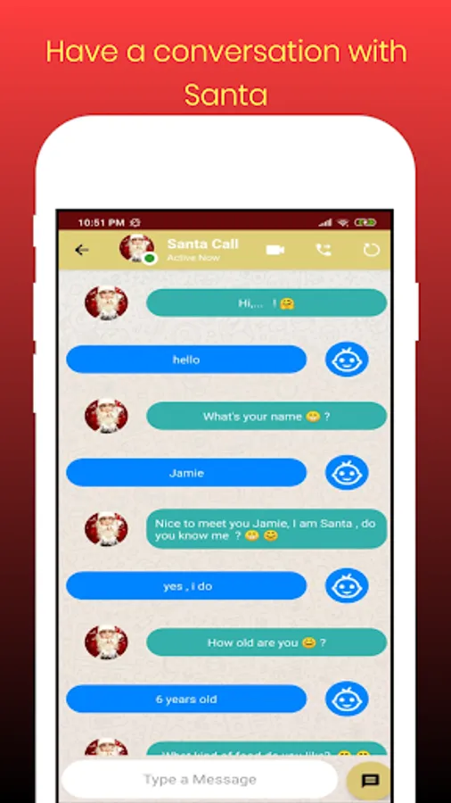 Fake Video call and Chat from Santa Clause is a simulation prank app that fakes incoming calls and fake incoming video calls, and simulate fake conversation with Santa Claus , (in case of a life video call). by a simple click you can go in a fake live with santa , it’s an easy app in order to entertain yourself and prank your friends and family and see their reaction , the calls looks so realistic and they will believe that santa is really talking to them.