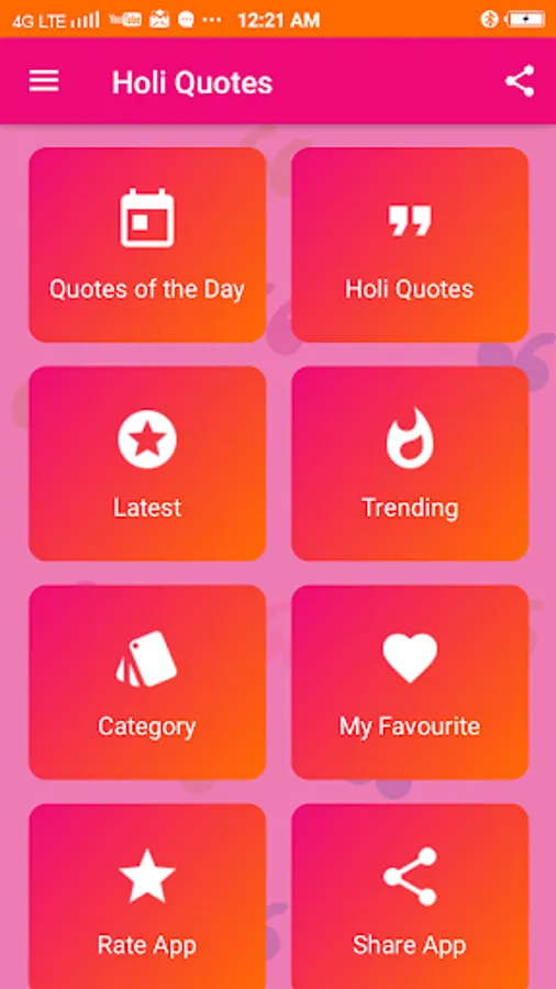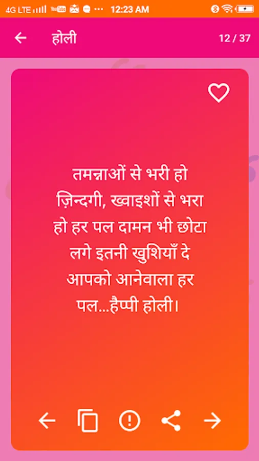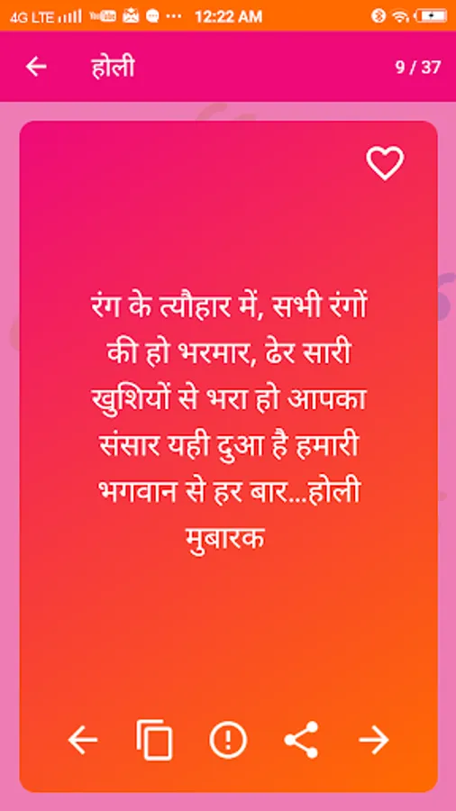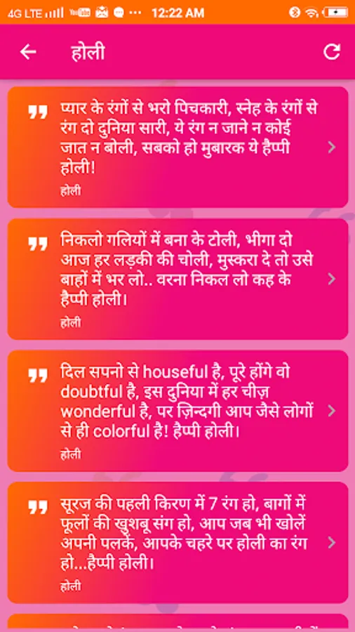 This app is a best collection of Holi Quotes and Happy Holi Wishes in Hindi. Holi is a festival of colors, joy and enjoyment while you will definitely be enjoying with family and friends. Wish your family and friends with happy holi shayaries.