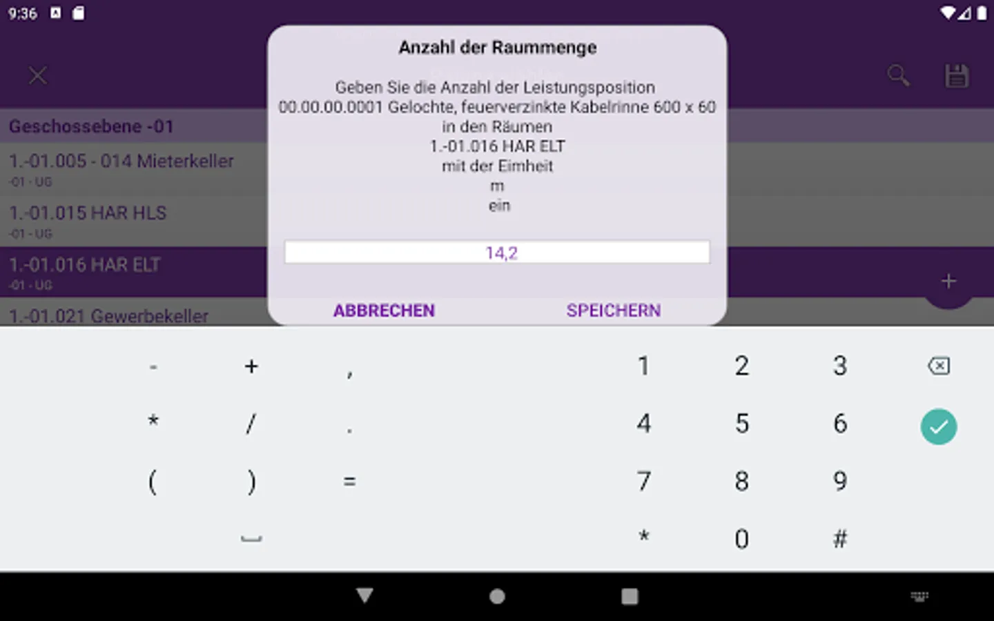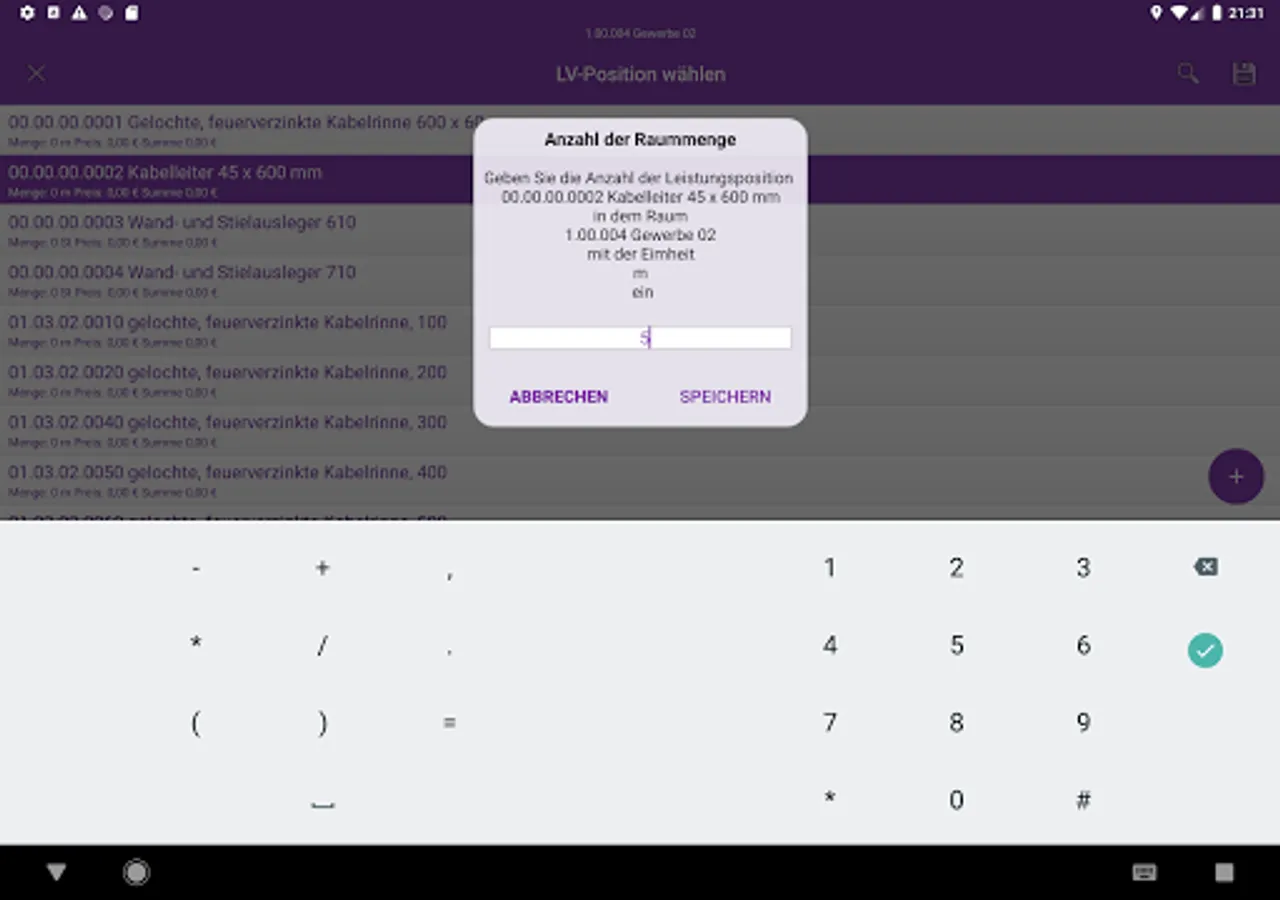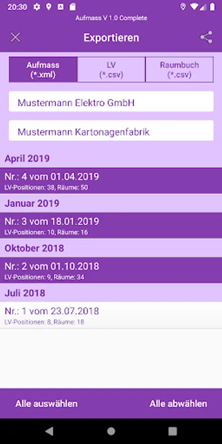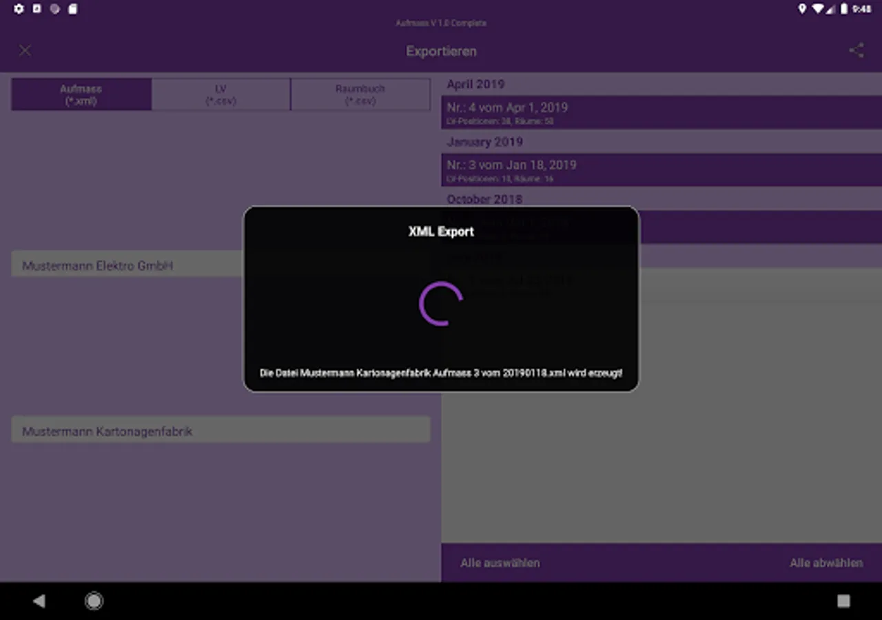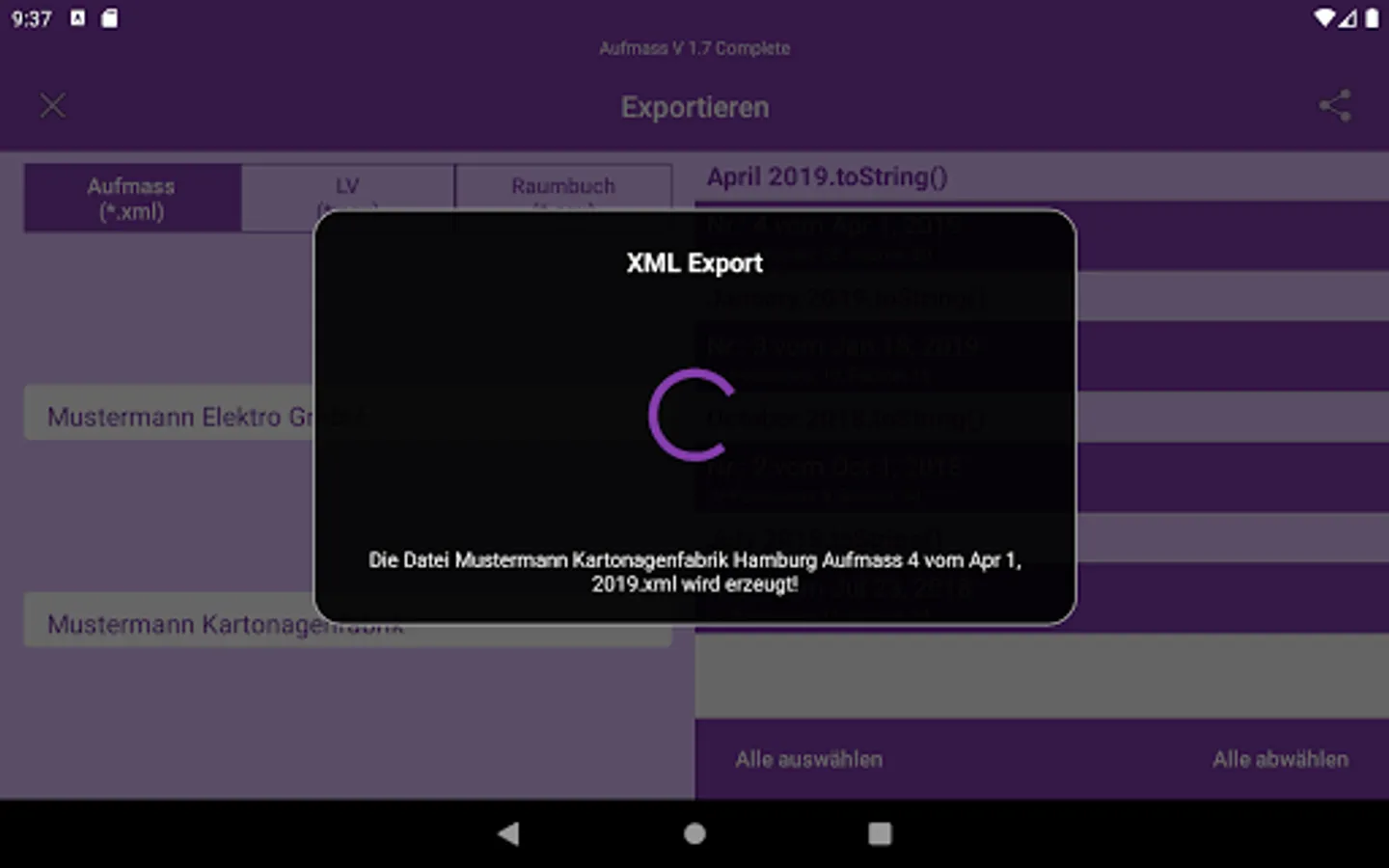 Using the export function, you can export quantities as * .XML and import them on another device with the allowance app. All service positions and rooms as well as the company and construction site will be taken over. The data in the XML file is encrypted and can only be read out via the app.