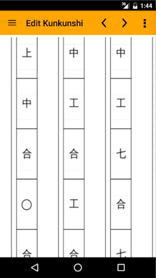 A kunkunshi contains the notes for the sanshin in a table. This table usually has 12 columns per page and 12 cells per column, except for the last page that just shows until the end of the music score. The table must be interpreted from top to bottom and from right to left, following the traditional Japanese reading system. Each pitch is represented by a different Chinese character, and it is possible to write a character between two cells to represent a note with smaller duration. It is important to notice that the Japanese characters do not represent fixed pitches as the western notes do, but they depend on the tuning of the sanshin, which in Okinawan jargon is called chindami. In addition to the notes, some special symbols are used to represent accidentals, repetitions and techniques such as hammer on, etc. Besides this table, the sheet may also include the notes for the voice and the lyrics of the song.