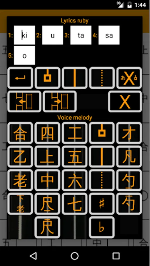 - The musical notes for the voice accept rare notes such as "才", "汎" and "勺", as well as some symbols that represent features of the singing, such as holding the note "|", increasing or decreasing the pitch gradually like in a glissando "¦", etc.
